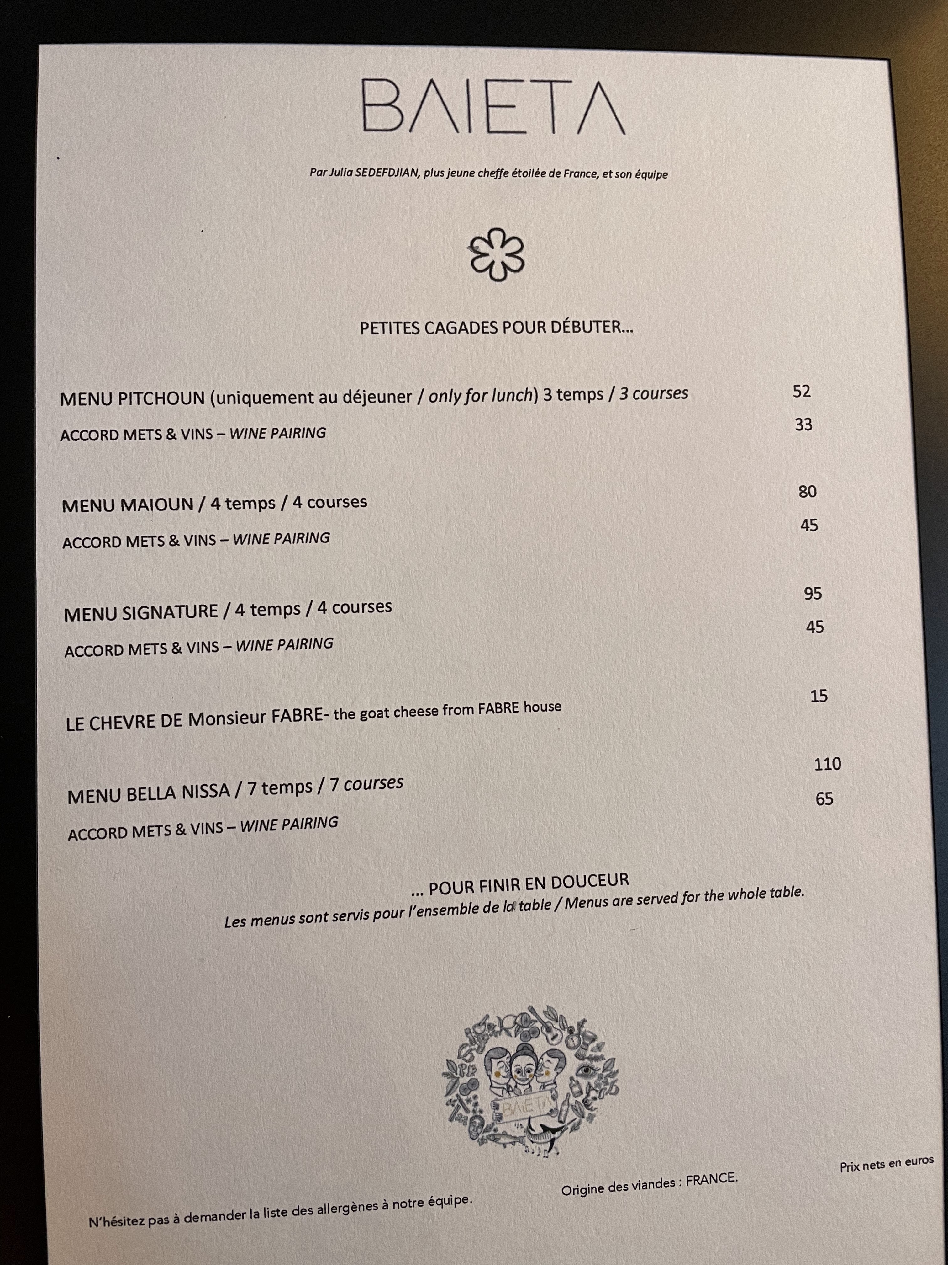 Menu dégustation en 7 services à 124€ absolument magnifique. Tout fut parfait : Amuse bouche pissaladière Tartare de daurade Œuf coulant, haddock Bouillabeta (bouillabaisse revisitée) : plat signature, une merveille Cochon caramélisé, carottes Dessert fraise Dessert chocolat J'y retournerai sans hésitation. Le talent n'attend décidément pas le nombre des années.