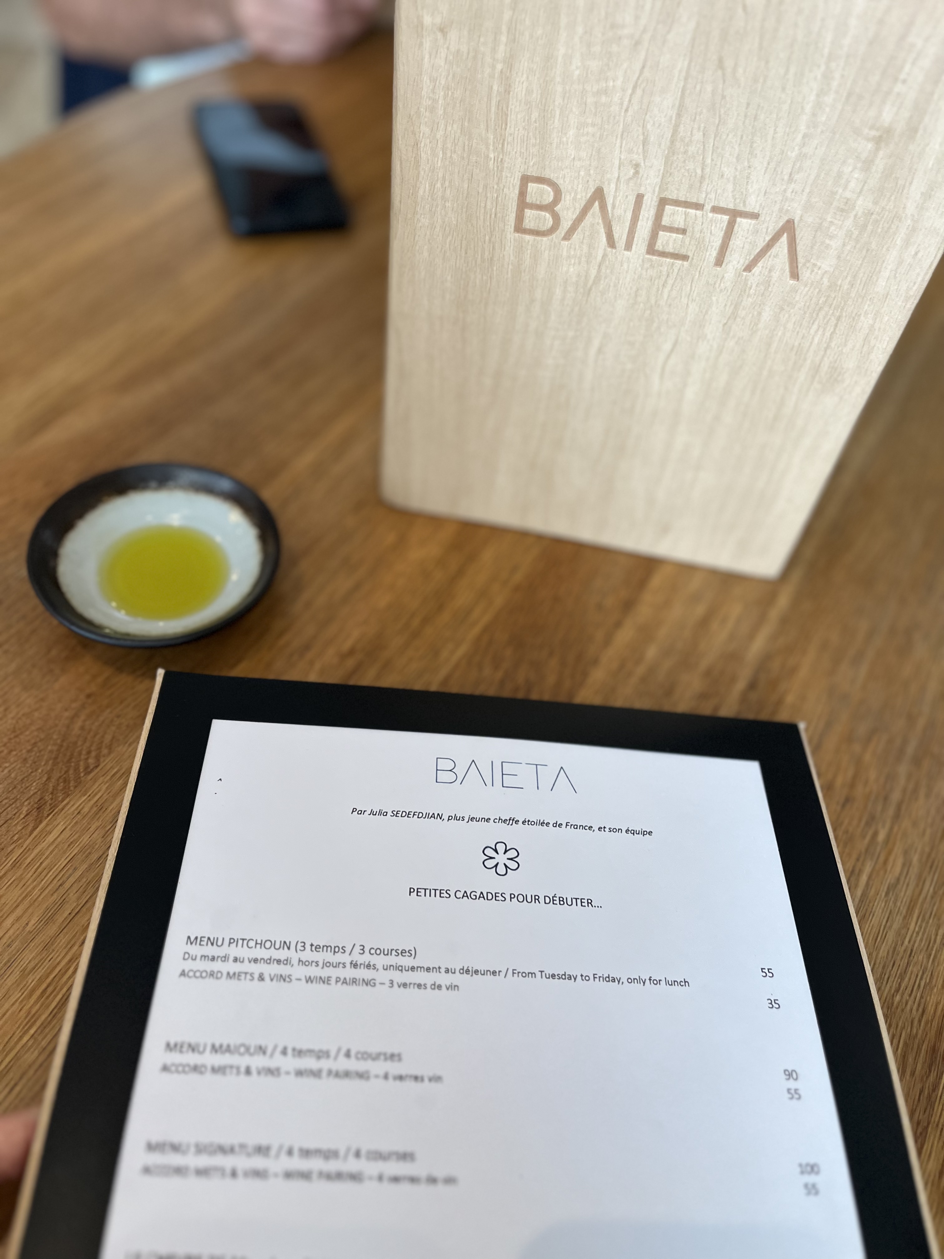 Cadre très sympathique, serveur à l’écoute et très réactif. Ils connaissent très bien leurs plats et la carte des vins, nous avons eu un très bon conseil sur celui ci. Nous avons choisi le menu BAEITA avec 6 plat (2 entrée - 2 plats -2 dessert)
