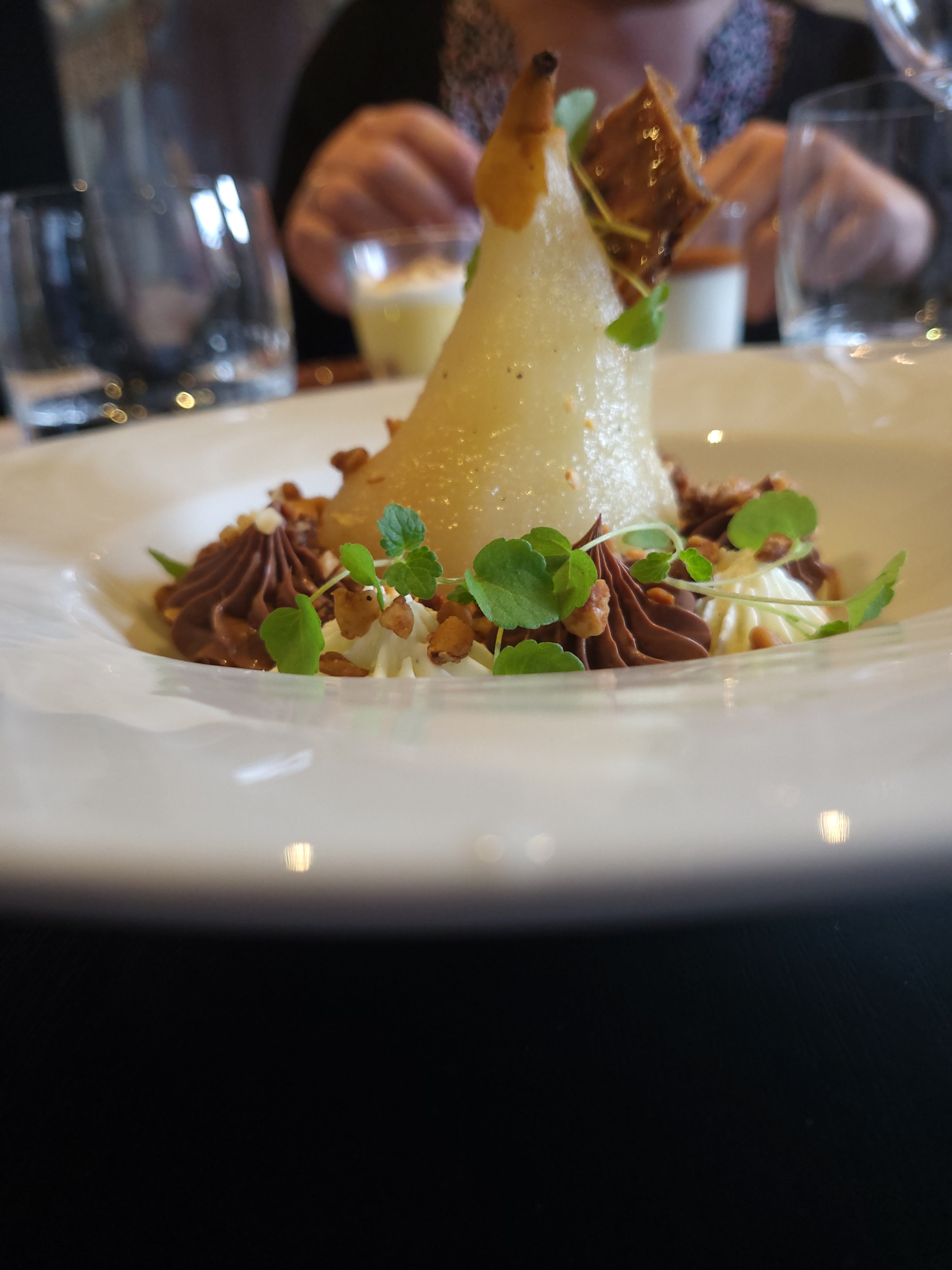 Une belle découverte ce restaurant. Des produits de qualités, une carte simple et variée. Un personnel souriant accueillant et à l’écoute de ses clients. Le cadre est également fort sympathique. Je n’ai pas pris nos plats en photo, voici le dessert de monsieur. Poire poché avec sa merveilleuse ganache. Petit clin d’œil au stagiaire. Merci pour votre service.