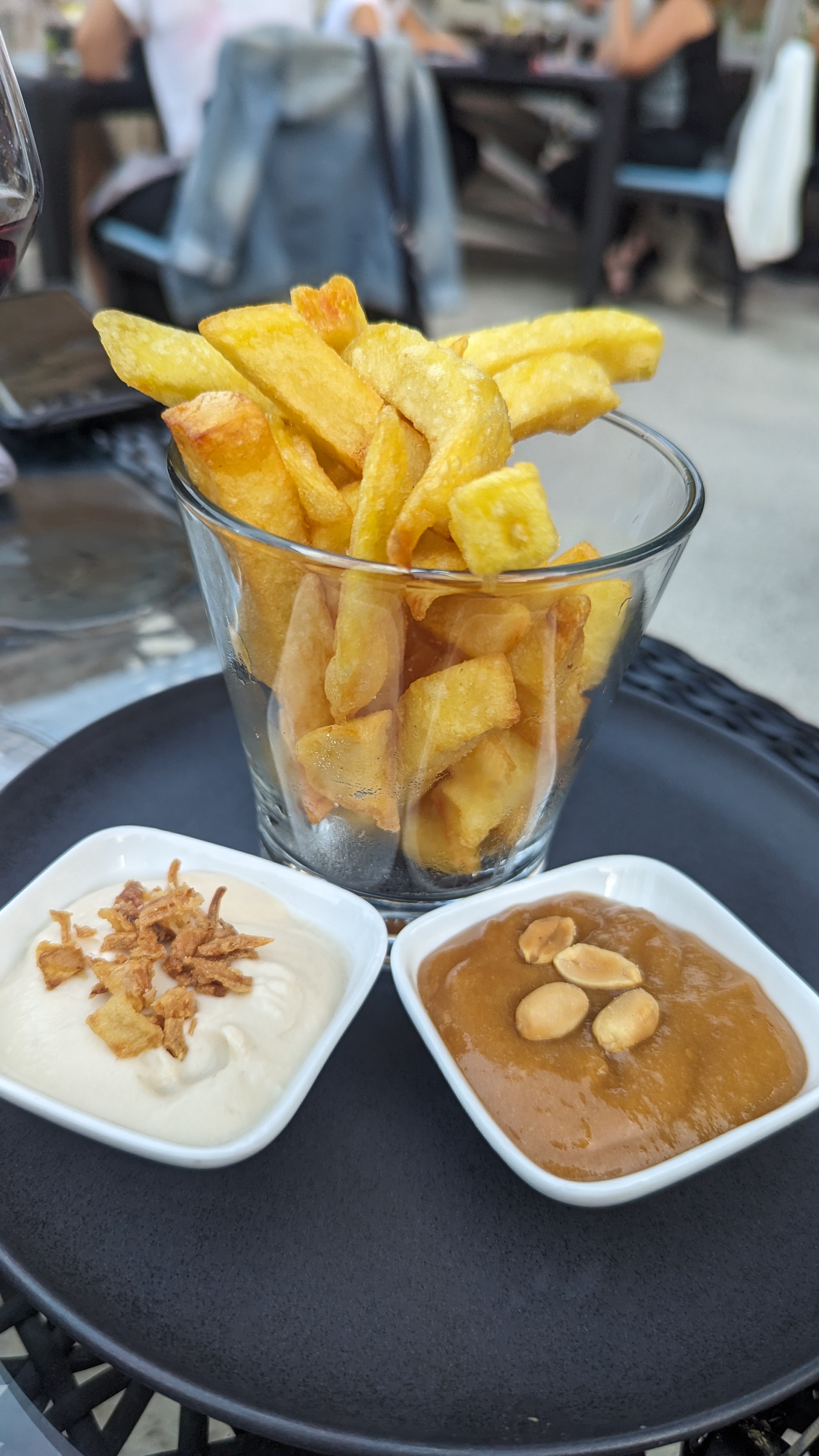 Ils vous servent des salades.. Mais pas de détails sur la carte . Resultat un mélange de viande et de poisson..et des Cacahuètes !!!! Bonjour ceux qui sont allergiques. Évitez le dessert..pomme au Mac vin ..ya de la pomme ..mais pas de mac vin !