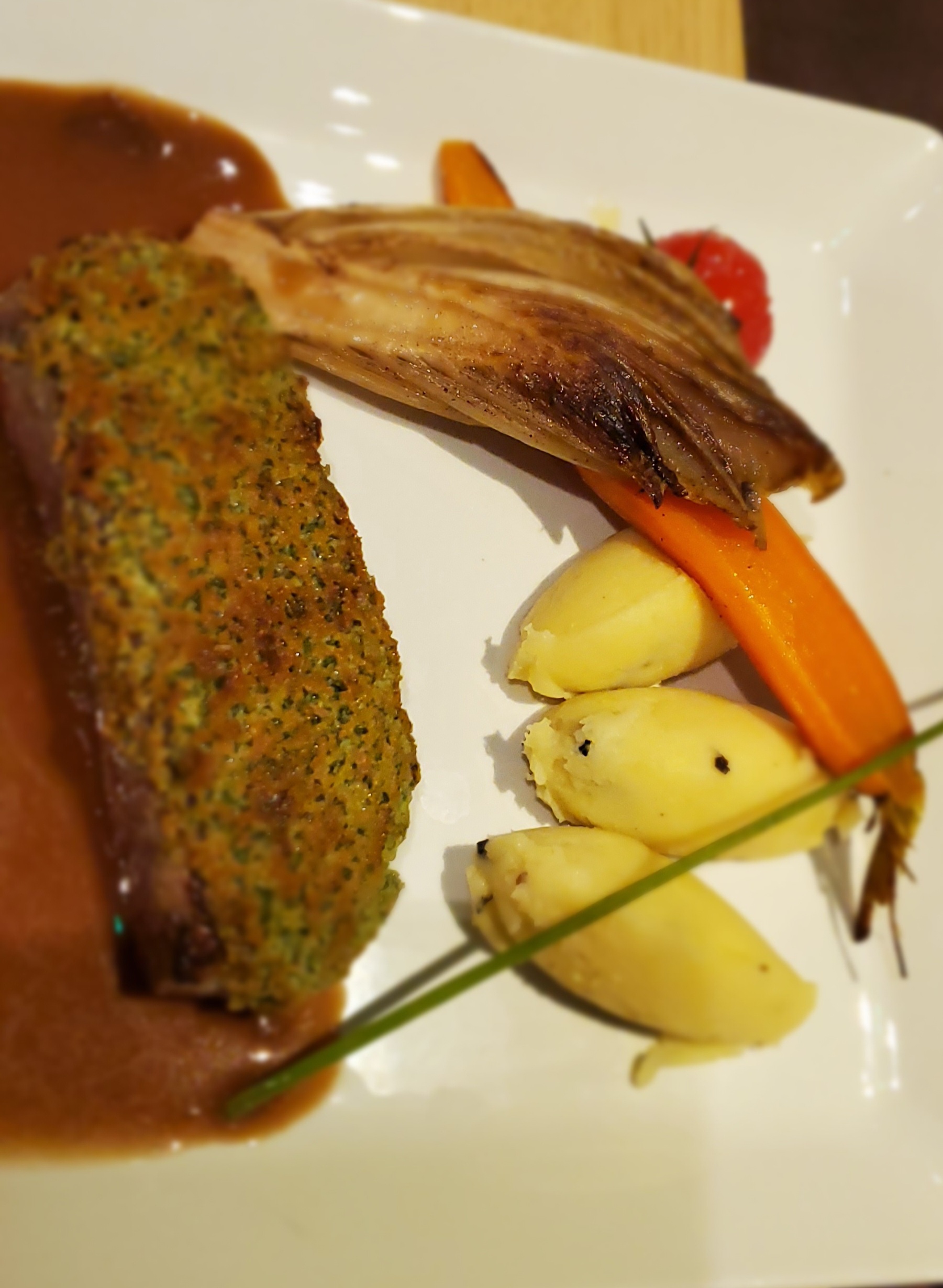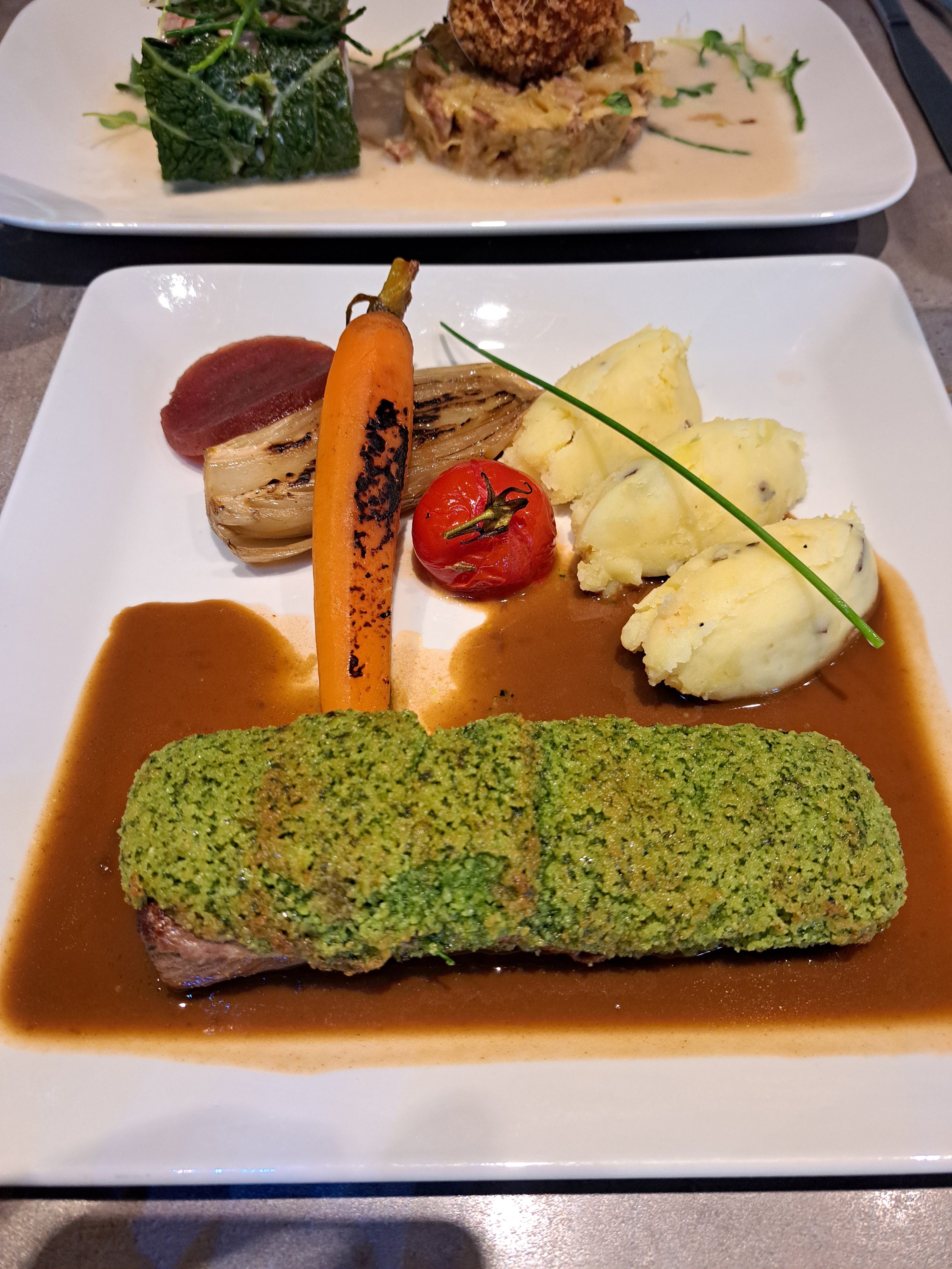 J'ai pris de l'agneau en croûte il était excellent accompagné de purée aux truffes excellente et une carotte avec oignon, d'habitude je suis difficile mais là les légumes étaient fondantq un vrai régal ça change des légumes presque crus qu'on nous sert tout le temps. Le personnel est très agréable, le stagiaire qui nous a servi très sympathique et professionnel. Je recommande à 100 % le tout servi en 1 heure de temps et pour un prix correct.