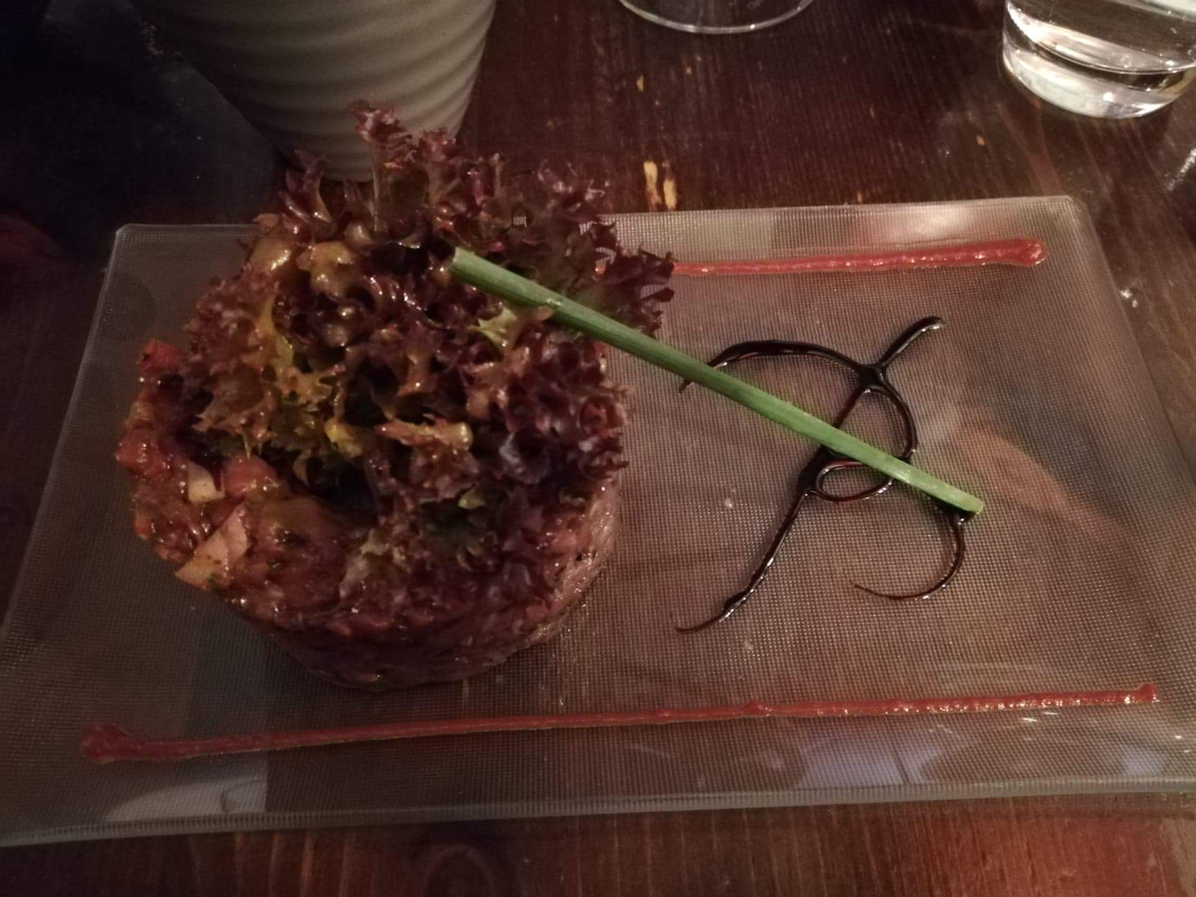 La carte est alléchante, les plats sont décrits avec précision. J’ai beaucoup aimé l’entrée (caviar d’aubergines subtilement relevée de poivre avec des chips de coppa). Le tartare de bœuf était très bon également avec un assaisonnement fenouil et épices. Je simplifie car chaque plat est composé de nombreux ingrédients et assaisonnements. La forêt noire revisitée est réussie. C’est bien, frais, efficace.