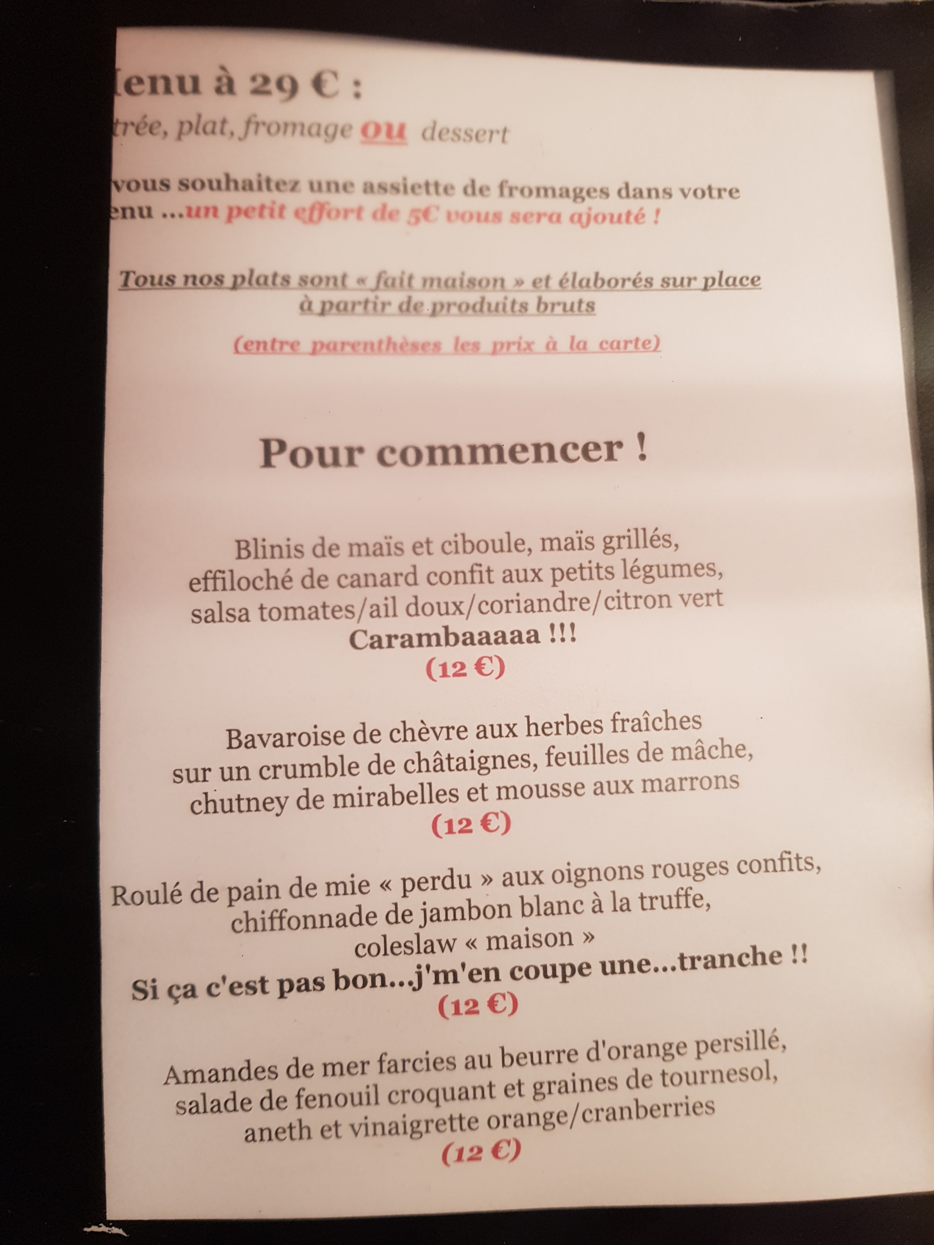 Accueil chaleureux et très professionnel Lieu cosy et intimiste Les entrées étaient délicieuses et originales Les plats bons ( viande un peu trop cuite - poulet et agneau ) Les desserts classique mais bon ( moelleux aux chocolats ) Le kir n’était pas bon du tout - je ne crois pas que c’était de la crème de cassis avec du bourgogne aligoté comme le veut la recette Malgré tout un bon moment mais un peu trop cher pour le résultat.