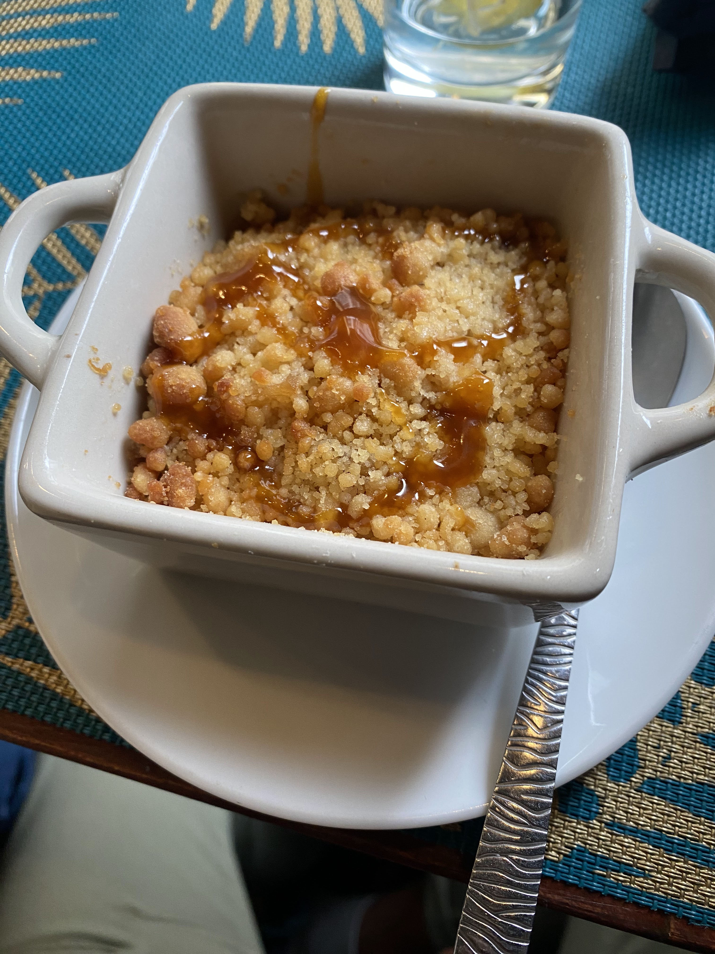 De l’entrée pastel au plat mafé au dessert crumble tout etait tres bon et en bonne quantité Monsieur très attentionné et cool au service Restaurant très beau soigné dans la deco et propre