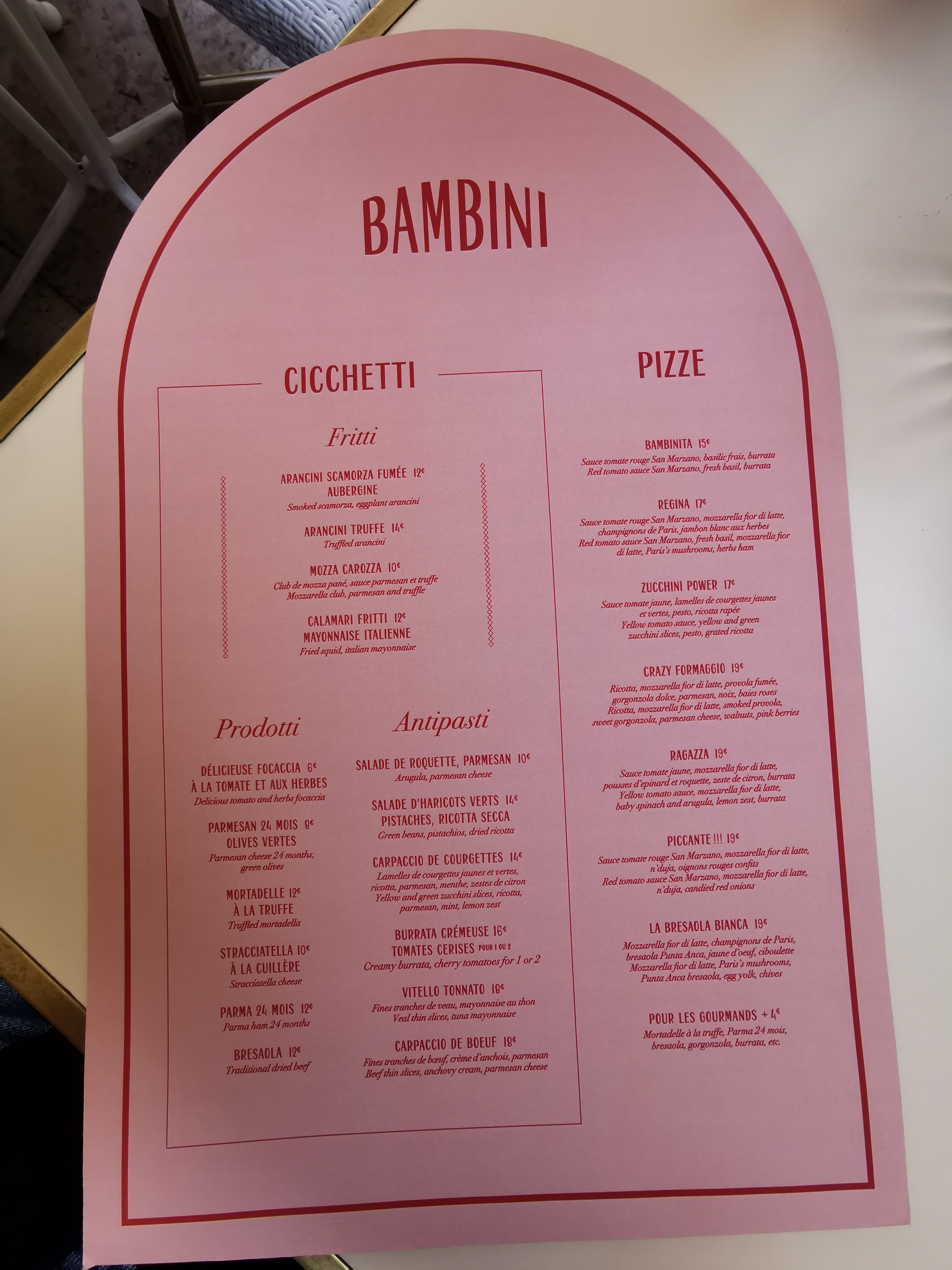 Chez Bambini tout est petit sauf le prix. Sentiment mitigé pour ce lieu exceptionnel objectivement utilisé pour proposer un service soit-disant haut de gamme. Haut de gamme de façade avec : - pas d'amuse gueule avec les apero, - une heure pour servir une pizzete, - plats chauds servis tièdes ou carrément froid, - pizza regina originale avec le jambon ajouté après la cuisson. Bref on y va pour se faire remarquer pas pour manger....