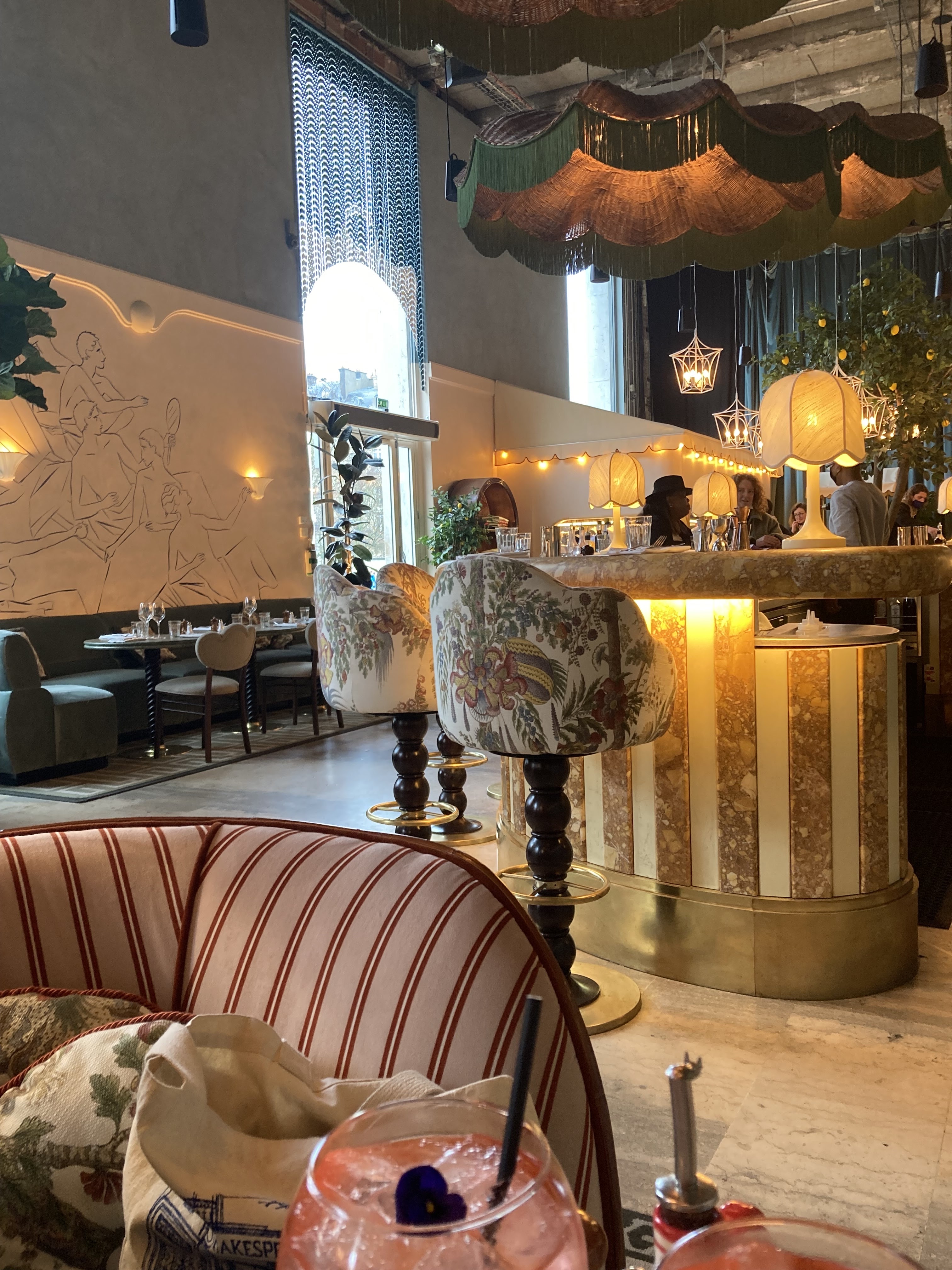 Une deco boheme eclectique ludique mais sophistiquee chargée mais harmonieuse. Une terrasse les beaux jours qui longe l'avenue. La nourriture plutot classiques (antipasti, des pizzettes, des plats de pates et qqs desserts). Le service peut mieux faire. Bcp d'attente. L'eau commandee qui arrive en milieu de repas. Une salade de tomates jamais servie (nous l'avons annulee car nous avions presque fini le repas). La carte de dessert a mis bcp de tps à nous être fournie. On a préféré juste commander une noisette qui est arrivée après une très longue attente et sans lait... Bref! Pas au top. La pizette napolitaine toute simple mais délicieuse. La salade roquette parmesan classique sans relief. Focaccia assez dense. Addition 43€ (pizzette, salade roquette, ficacia, une bouteille d'eau plate et un cafe)