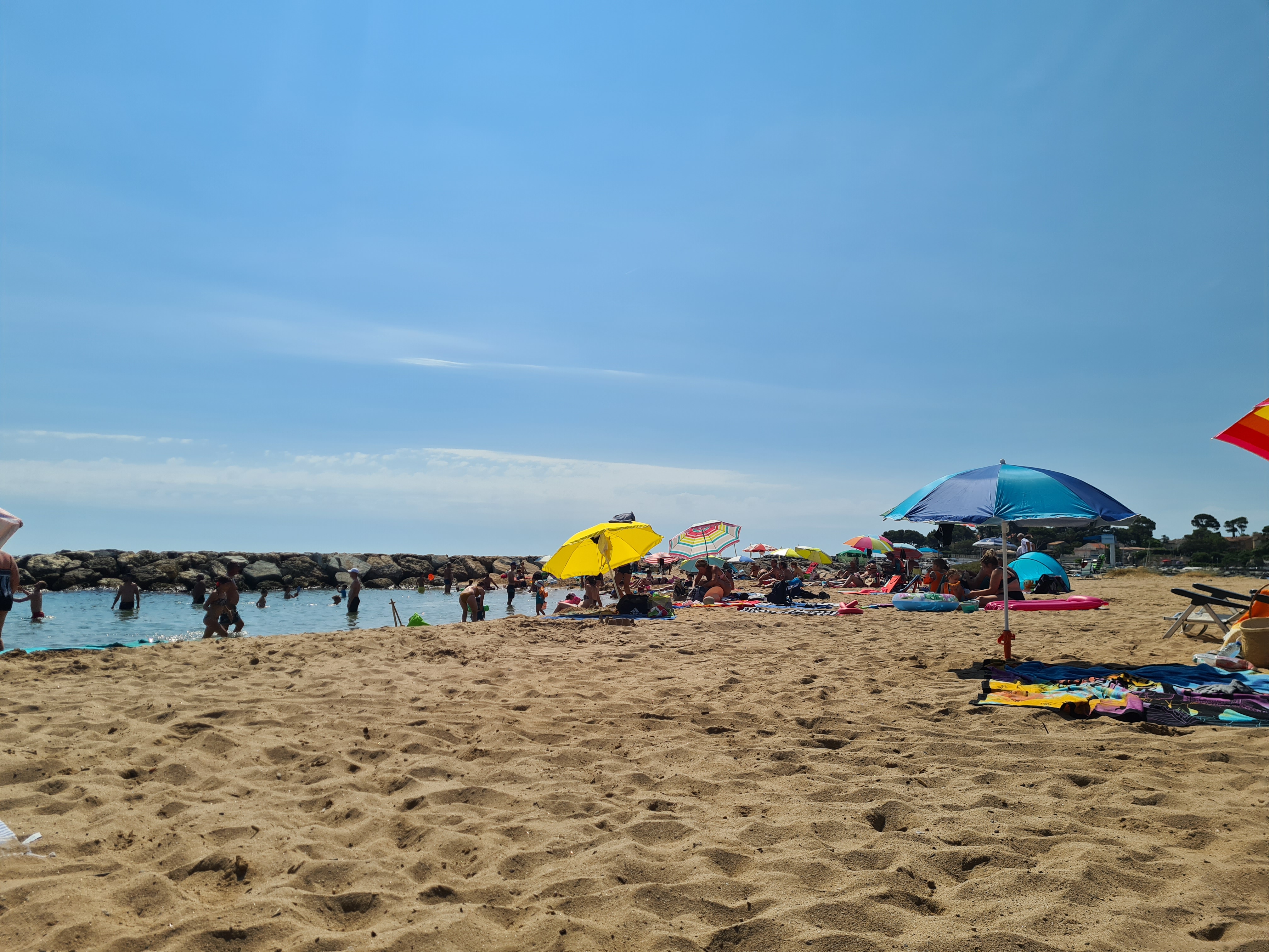 Ces plages en forme d'épis ont de nombreux avantages car elle permettent aux nageurs de choisir l'endroit pour nager en fonction du vent et des vagues et ceux qui restent sur la plage peuvent plus facilement trouver une bonne place bien abritée du vent mais en bord de mer en fonction des rochers de protecton qui ont été placés. Moins dangereux pour les petits enfants qui ont pied plus loin et donc plus facile à surveiller. De plus, ces plages sont nettoyées très régulièrement. Bravo aux responsables de Saint Aygulf