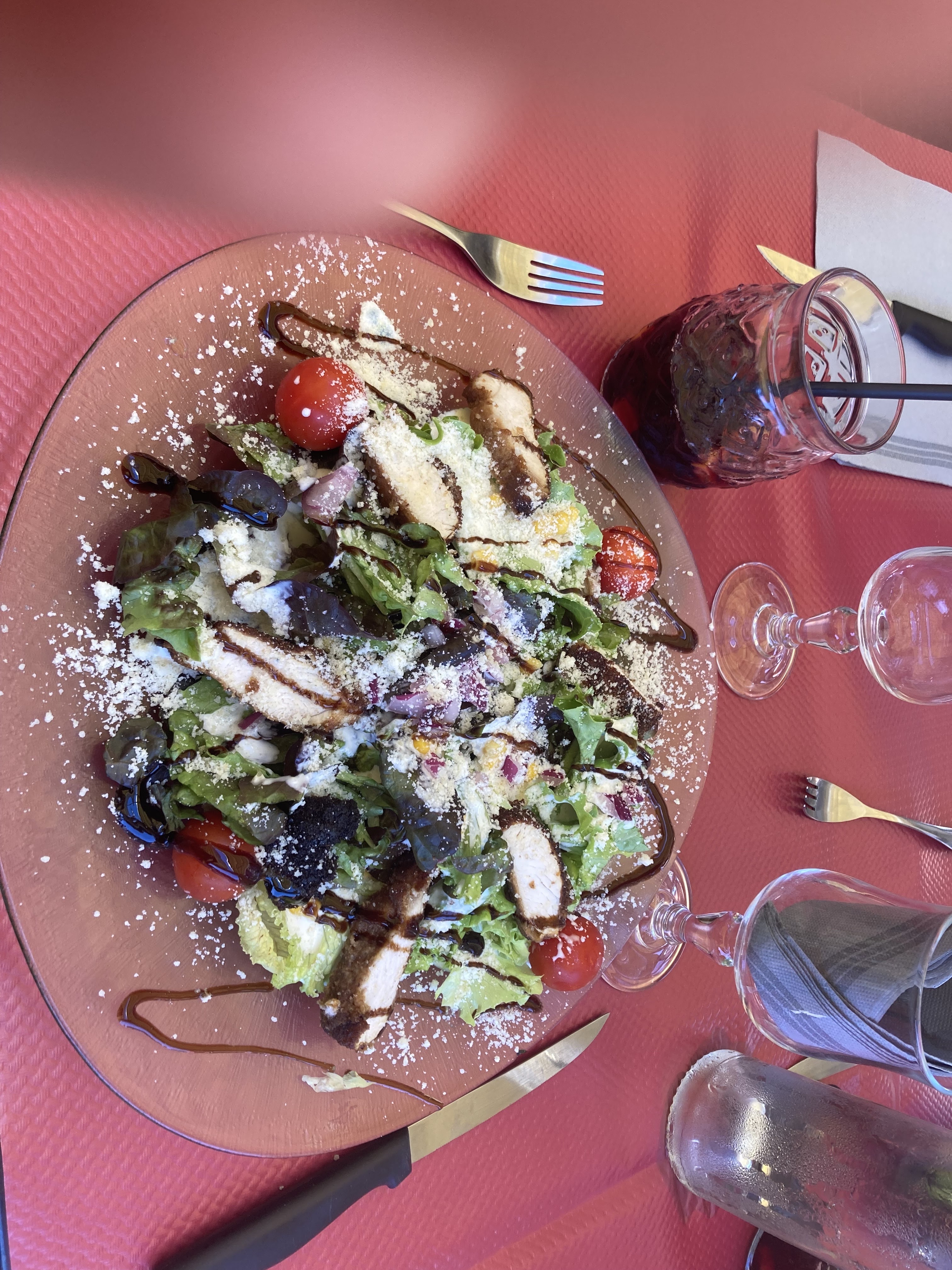 A fuir à tout prix le patron prends les touristes pour les portes feuille et l’assumes. SPECTACLE LE DIMANCHE MAGNIFIQUE LA SEULE RAISON POUR Y MANGER !! Nourriture honteux 15€ une salade cesar avec plus de salade que de garniture (4 petit panne de poulet, 2 petit bou d’oignon parmesan en poudre et 3 morceau de maïs pas de croûtons pas d’œuf) Plat qui n’arrives pas en même temps 20 minutes pour que la pizza arrive et 30 minutes d’attente pour un verre de vin