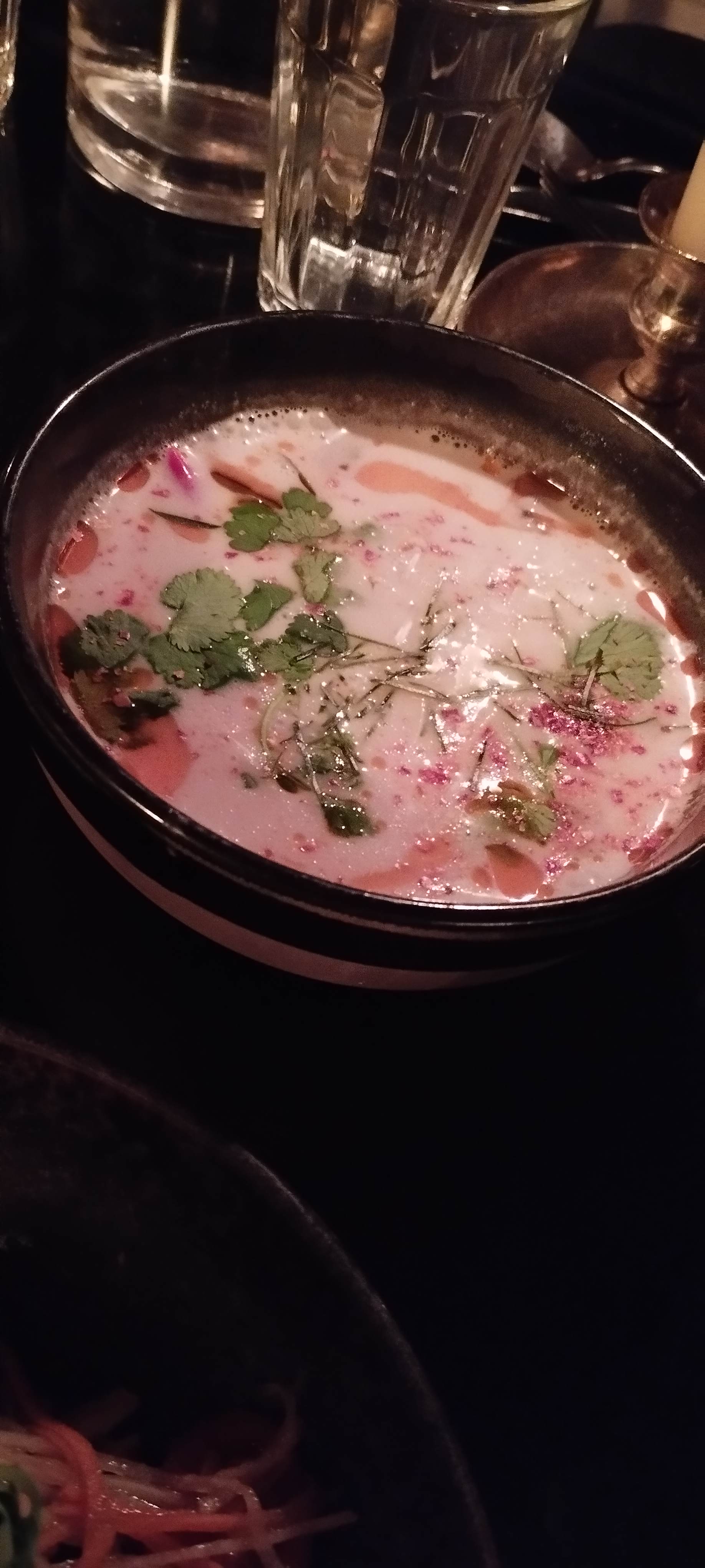 Restaurant vraiment jolie cependant la carte n'est pas à la hauteur de la décoration ni de sa réputation. 25 € pour un poisson basique recouvert de coriandre ( voir photos ) , on s'est retrouvé avec un poisson sauce coriandre . L'accompagnement à 8€ pour du simple riz est assez excessif . L'entrée pour 4 raviolis bon mais pas incroyable est chère aussi . Le plat au cajou était quand même très bon , c'était bien le seul plat de la soirée, dommage. L'accueil est agréable dommage que les serveurs ne prennent pas exemple.. Restaurant que je laisse volontiers aux instagrameurs et influenceurs .