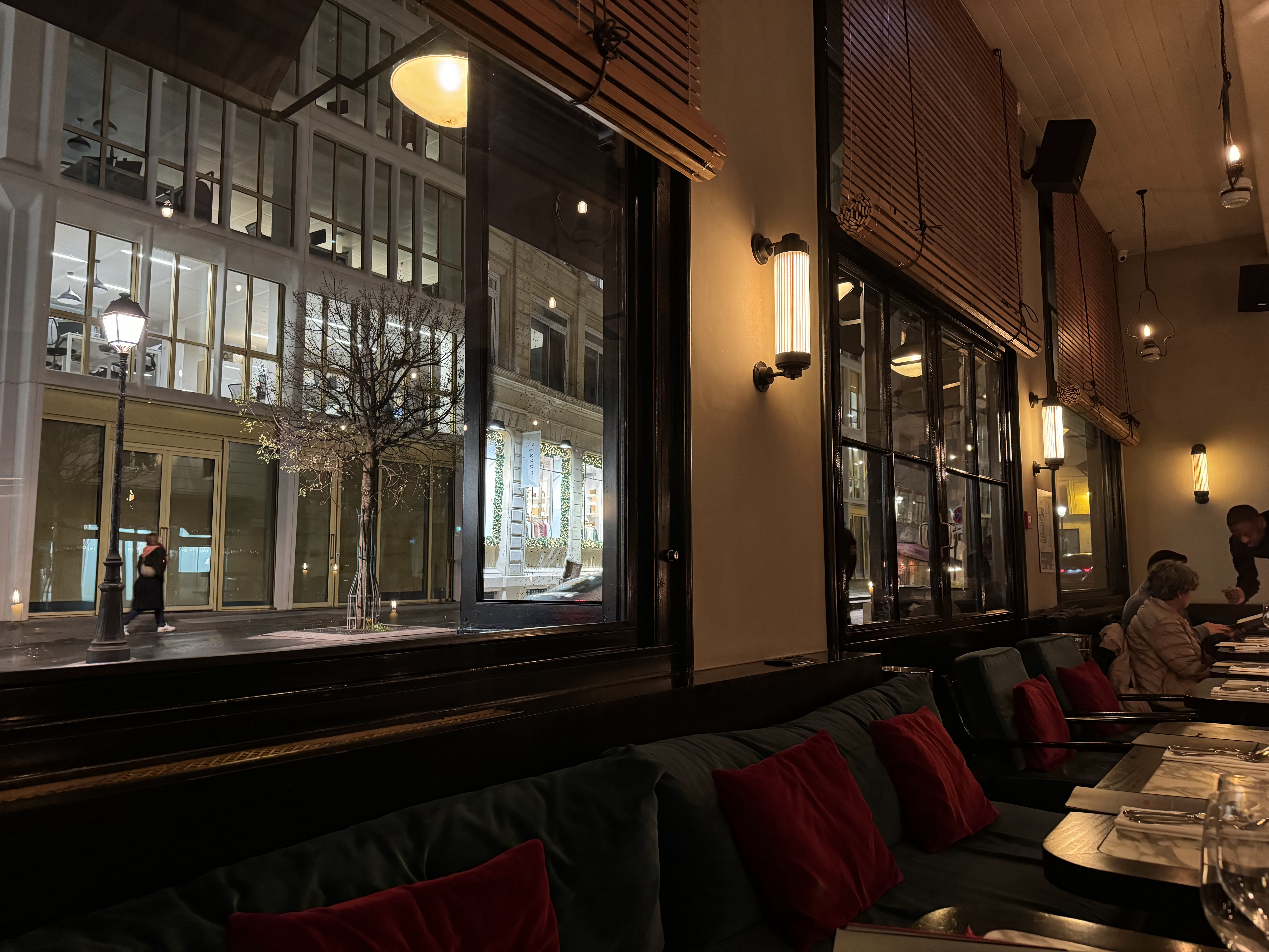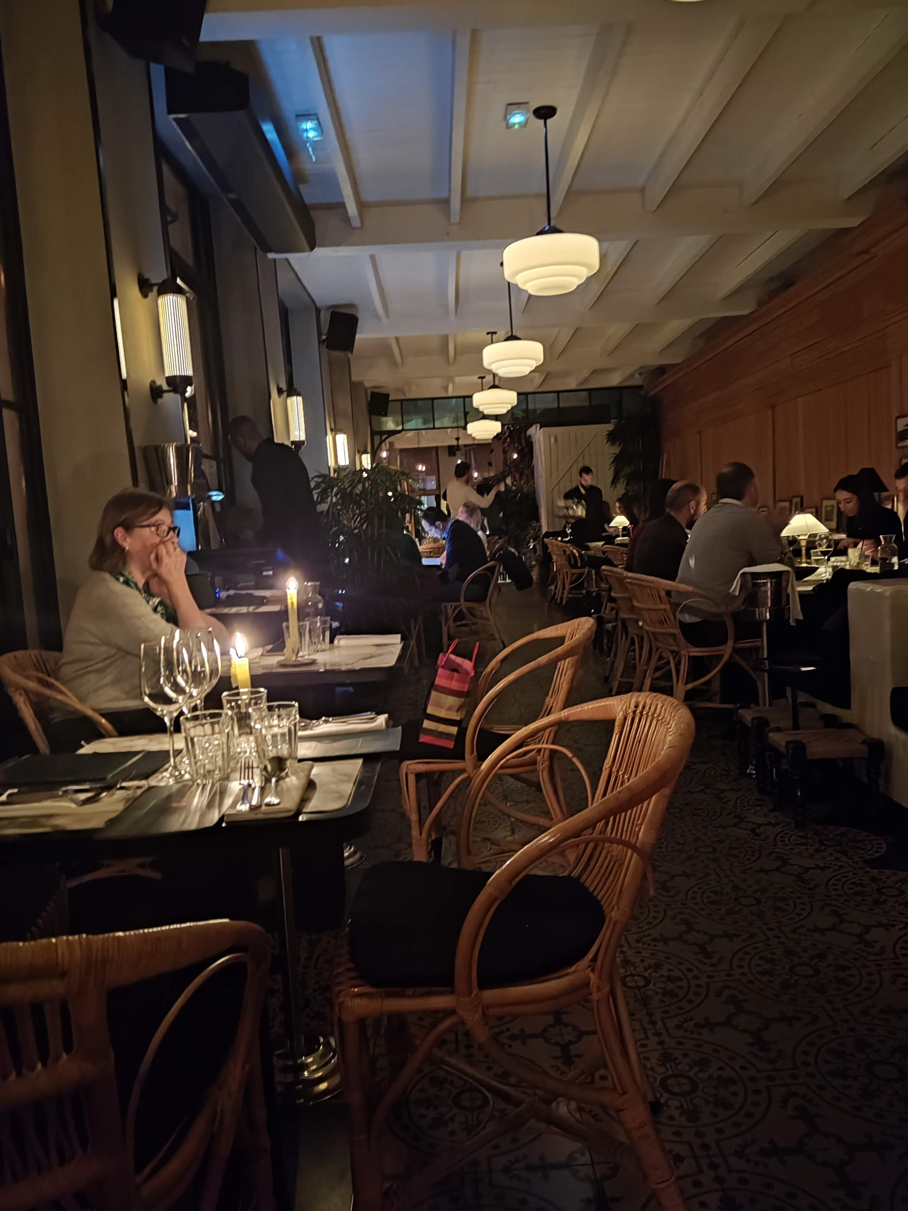 Joli restaurant aux lumières tamisées qui nous rendent beaux :-) Belle table, un peu petite pour trois, belle vaisselle, siège confortable. Serveur attentionné, connaissant bien la carte variée et alléchante, service rapide. Mets savoureux et copieux. Vins et cocktails bons mais chers. Ravie et de retour bientôt