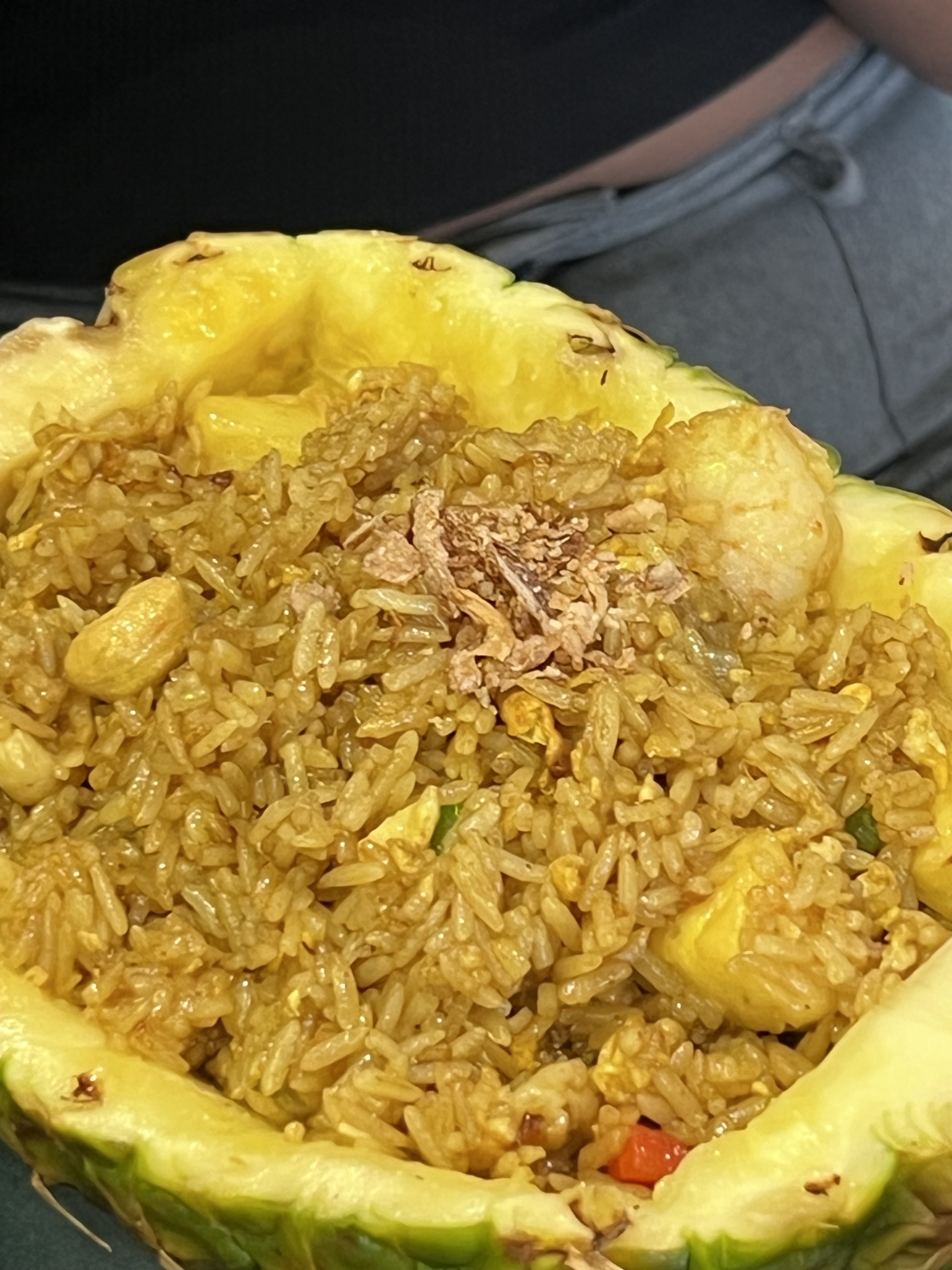 Très bon riz thaï epicéau poulet servi dans une demi coque d’ananas