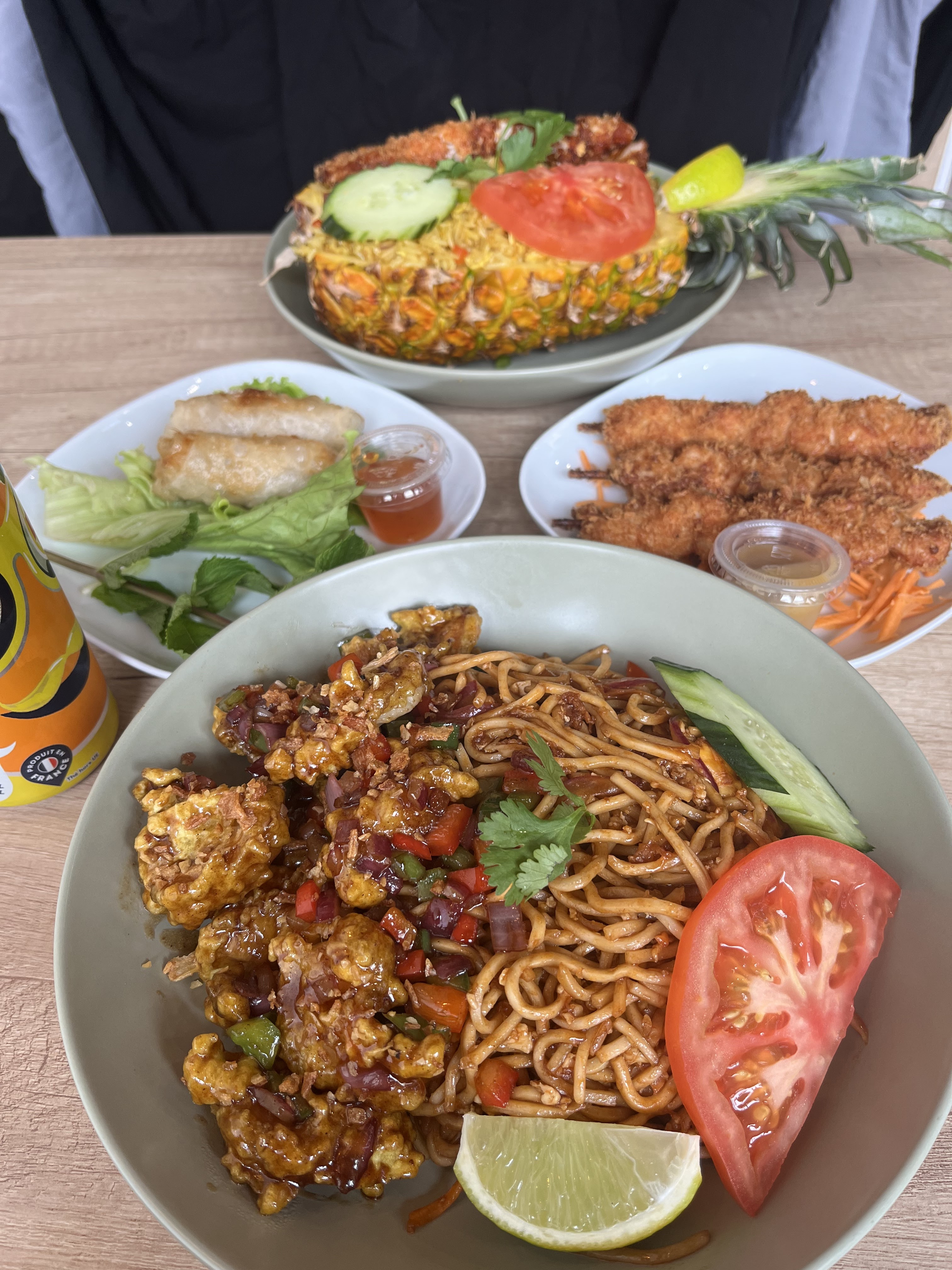 On y a mangé avec une amie, c’était notre première fois et nous avons adoré ! Les plats sont super bons et copieux, on a pu goûter aux nems au poulet, aux crevettes tempura, à la salade crevette mangue, au poulet dynamite (une pepite d’ailleurs !) , au riz thaï à l’ananas et au tigre qui pleure. Nous avons tout aimé ! Et l’accueil était sympa avec une dame très gentille. Nous recommandons 👍