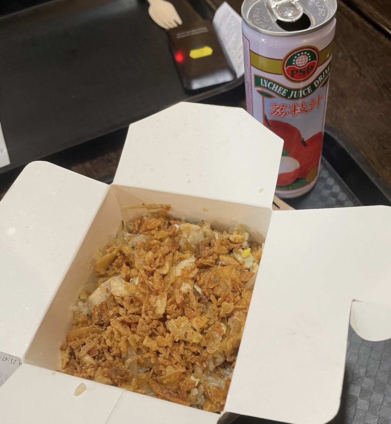 Intérieur qui aurait besoin de renouveau, assise des chaises craquelées, tables bancales mais super bon , j’ai pris des nouilles udon avec sauce saté légèrement épicé avec oignon frit. Un super goût, un délice.