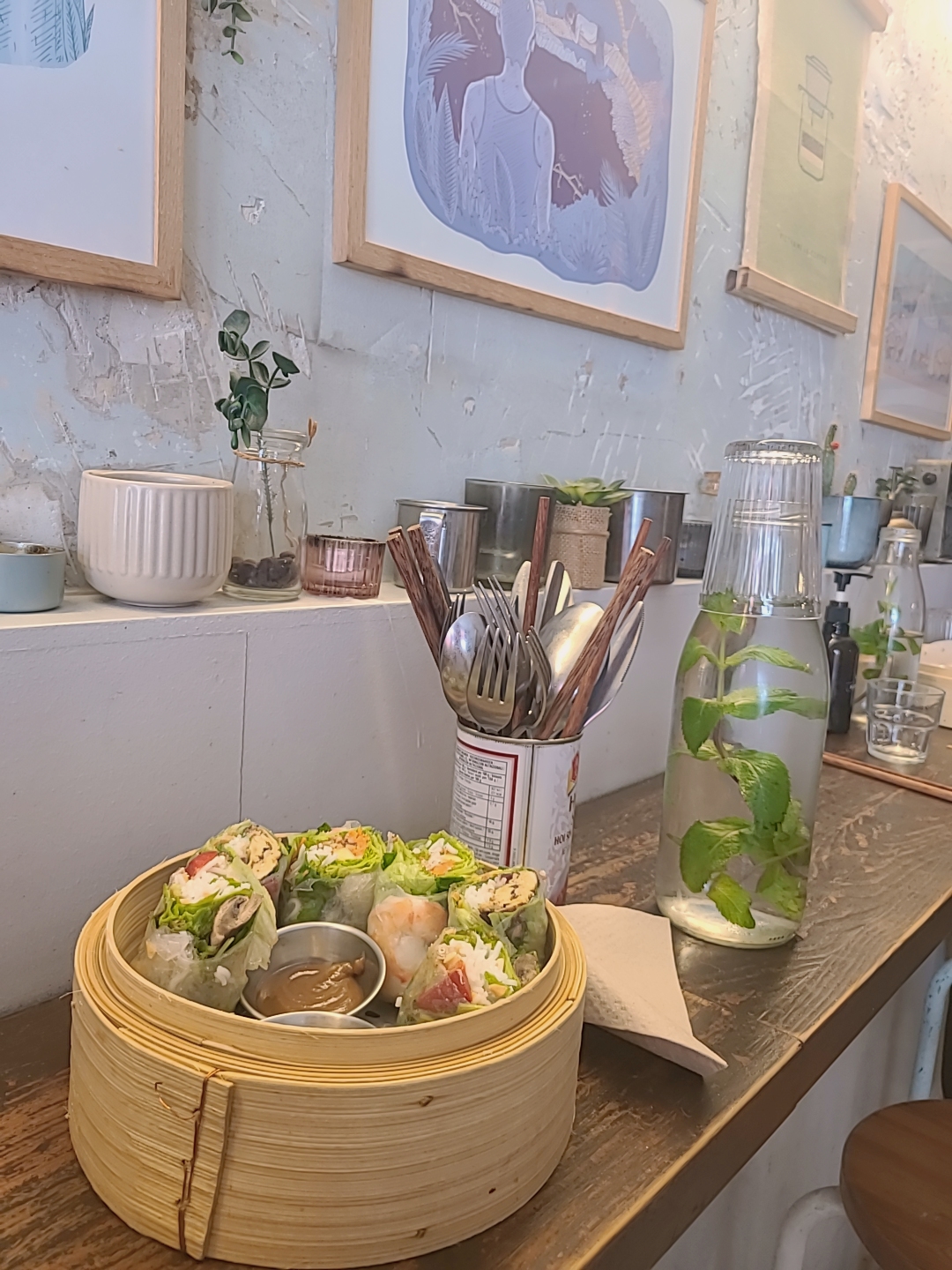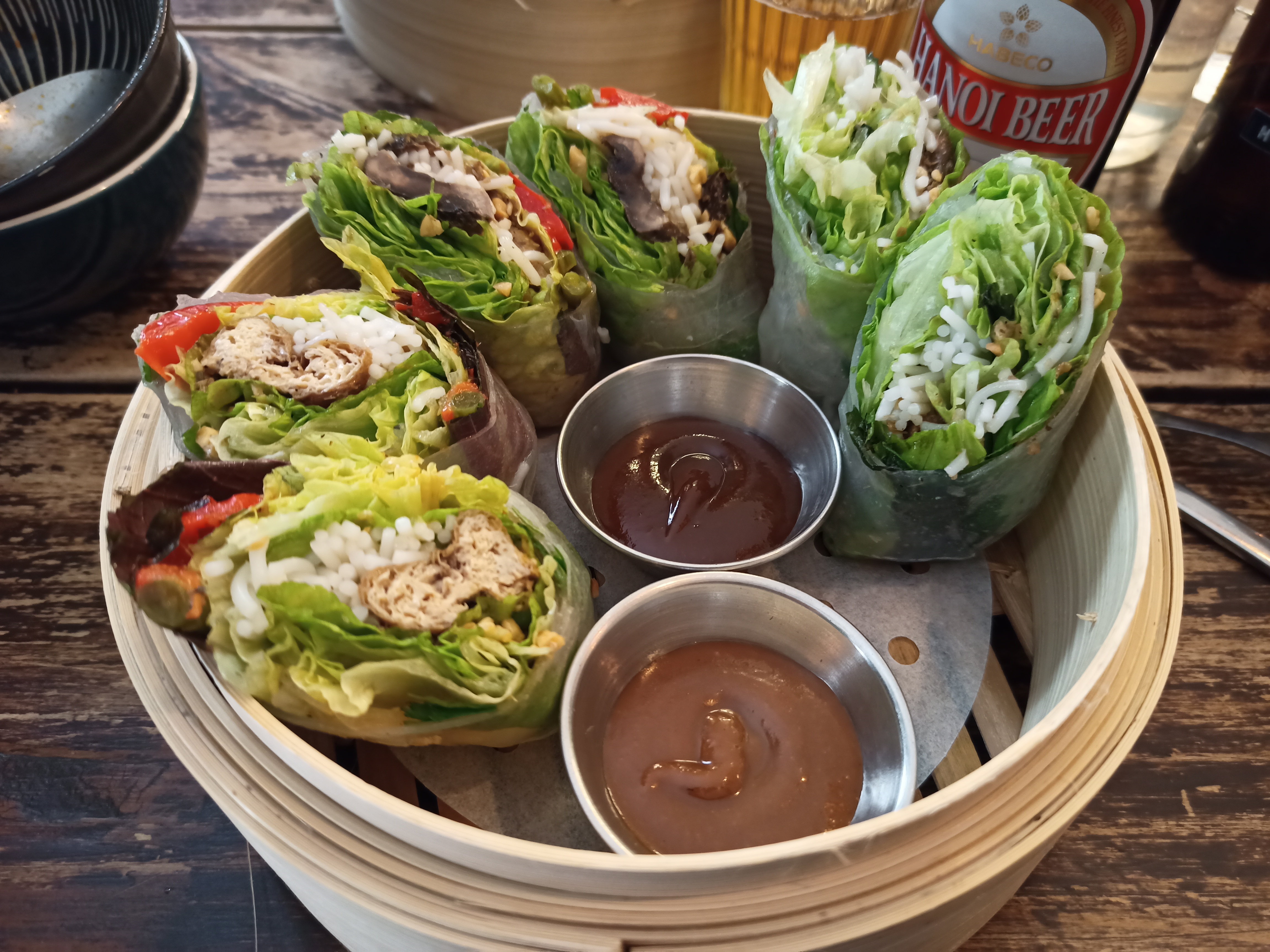 Belle découverte. Petit endroit immersif avec une déco dépaysante. Le personnel est très sympathique. J'aime beaucoup la présentation des spring roll dans les paniers traditionnels. Niveau goût juste trooopp bons. Les saveurs cuisson des ingrédients et l'assaisonnement sont parfaits Les meilleurs springs roll que j'ai pu manger. J'ai pris végé crevette et Tofu. 3 suffisent à caler sans trop blinder. Pour 11.40€ ! A refaire pour tester les autres rouleaux et les petits dessert et entrée :) Les sauces sont très bonnes aussi et maison !