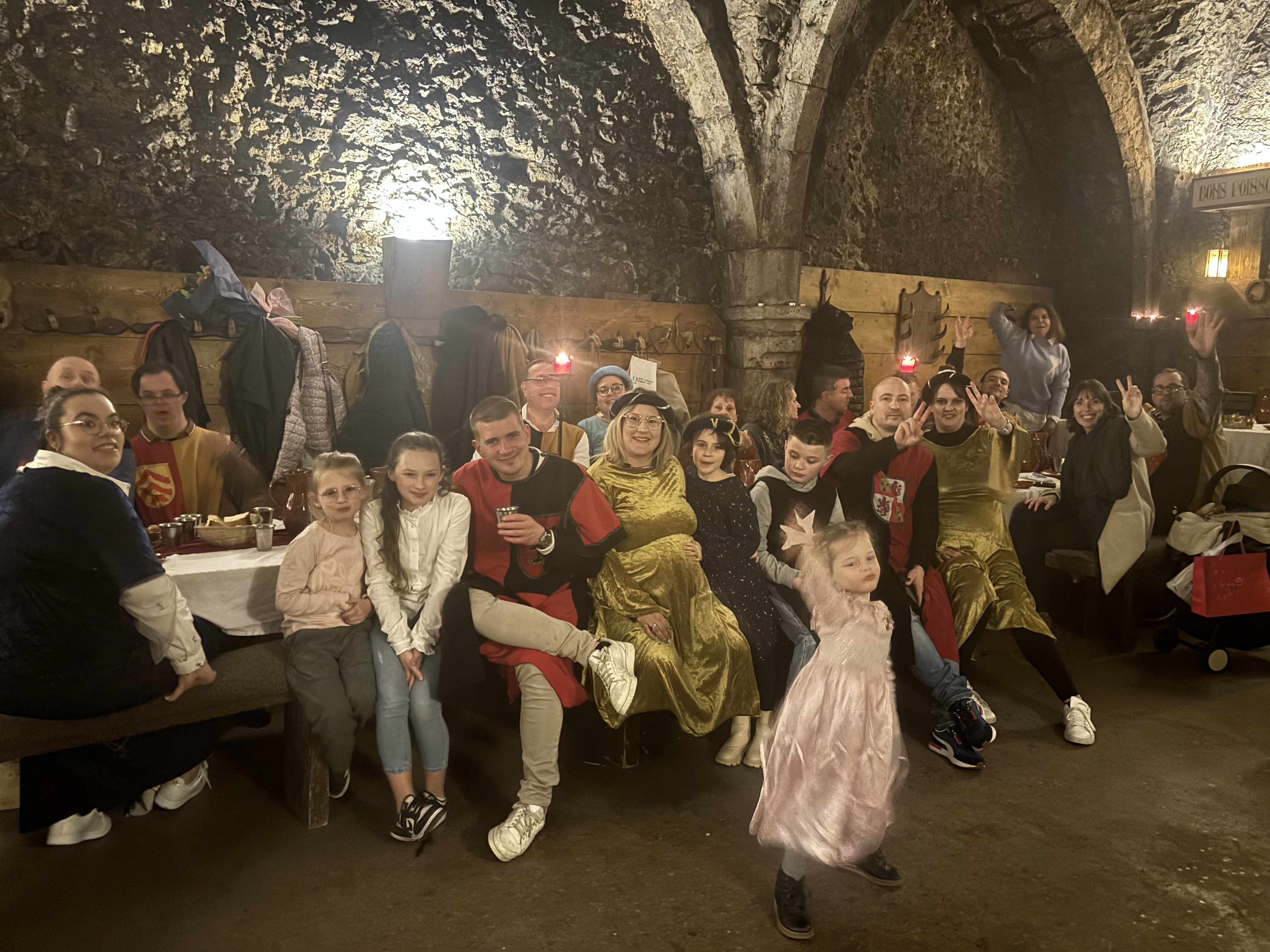 Nous sommes venus pour un anniersaire avec 19 personnes. Un dimanche 12h. Cela fait la deuxième fois que je viens ici. La réservation ce passe via internet. Le stationnement peut se faire gratuitement vers le parking Sainte croix. 10 bonne minute de marche. Le banquet ce fait du coup dans une magnifique salle voûte. Il est pas nécessaire d'avoir une grosse couche de vêtement. Le déguisement est compris dans le prix. Le repas est fait d'alimentation utiliser à l'époque. Boisson compris. Entre chaque étape du repas il fait pleins d'animations avec plusieurs personnages de l'époque. Le repas dure environ 3h. Cela permet de visiter apres la côte médiévale. Très heureux d'avoir fait mon anniversaire là-bas.