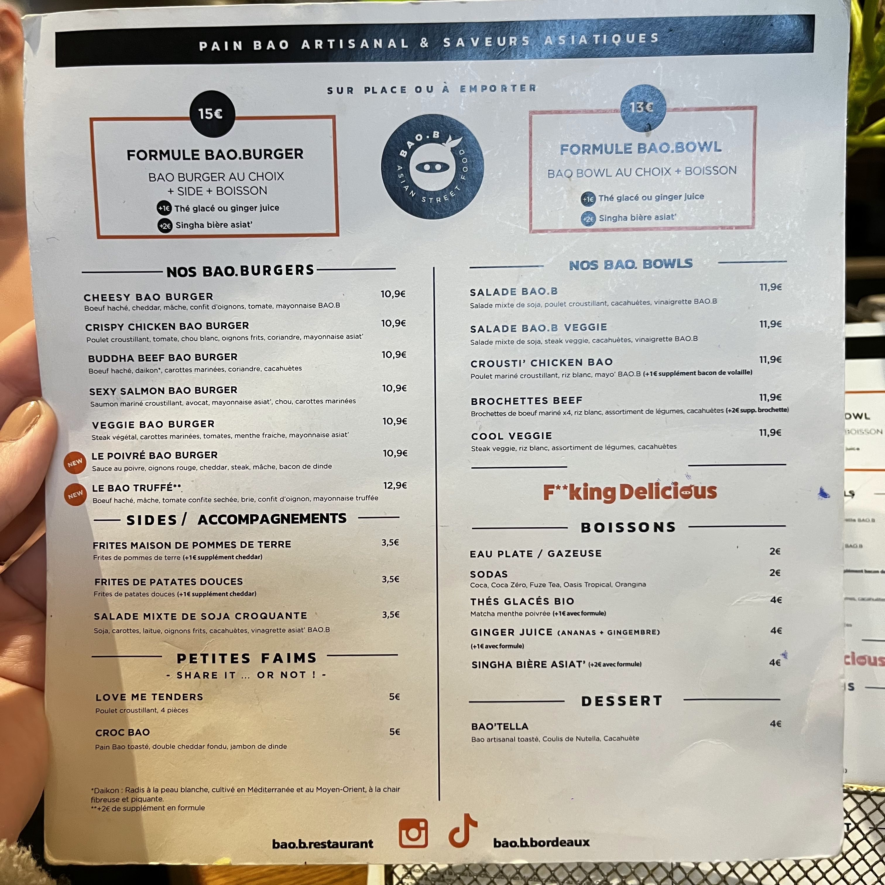 Je me promenais dans le centre quand je suis tombé sur Bao.B ... Accueil chaleureux, cuisine asiatique au top frais, excellent mélange de l'Asie et de la street food a prix plus que correct pour cette qualité. J'ai testé le burger au poivre ! Un délice avec des frites maison. Une équipe souriante et au petit soin pour ses clients... J'ai discuté avec le gérant qui est très sympathique ! Pour ma première fois à Bordeaux, je suis ravie de cette adresse. Je la recommandé vivement! Je reviendrai ;)