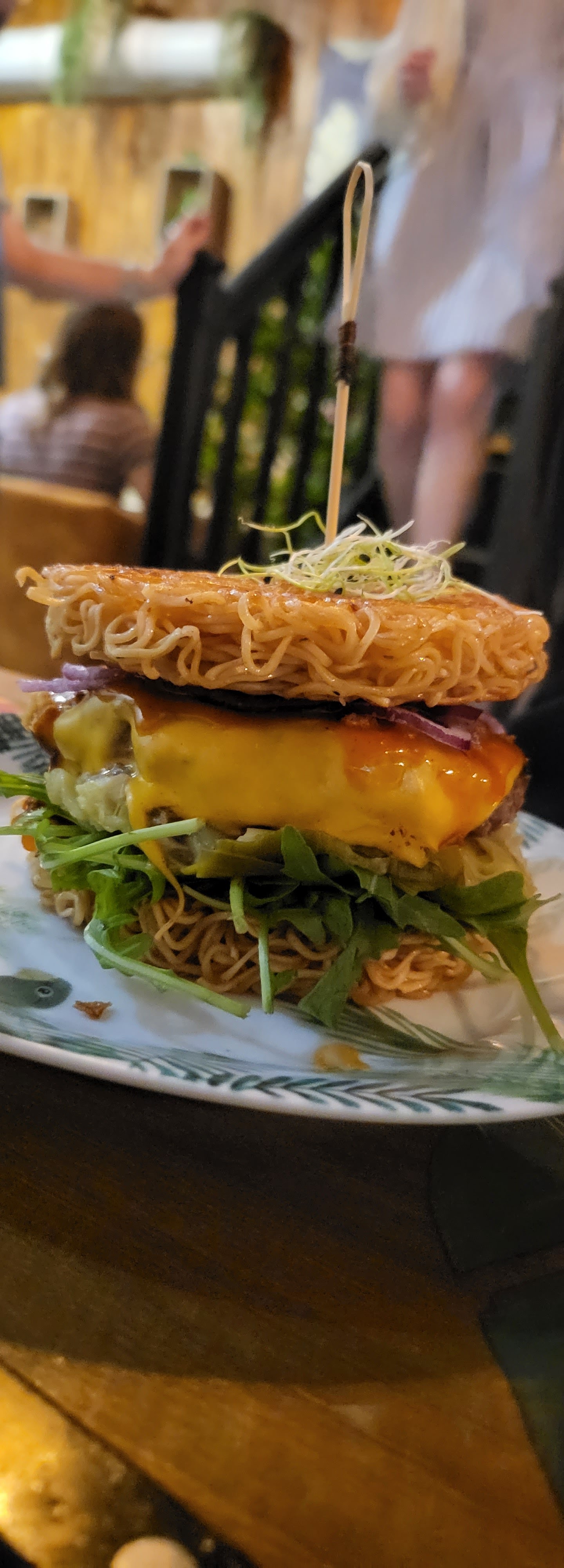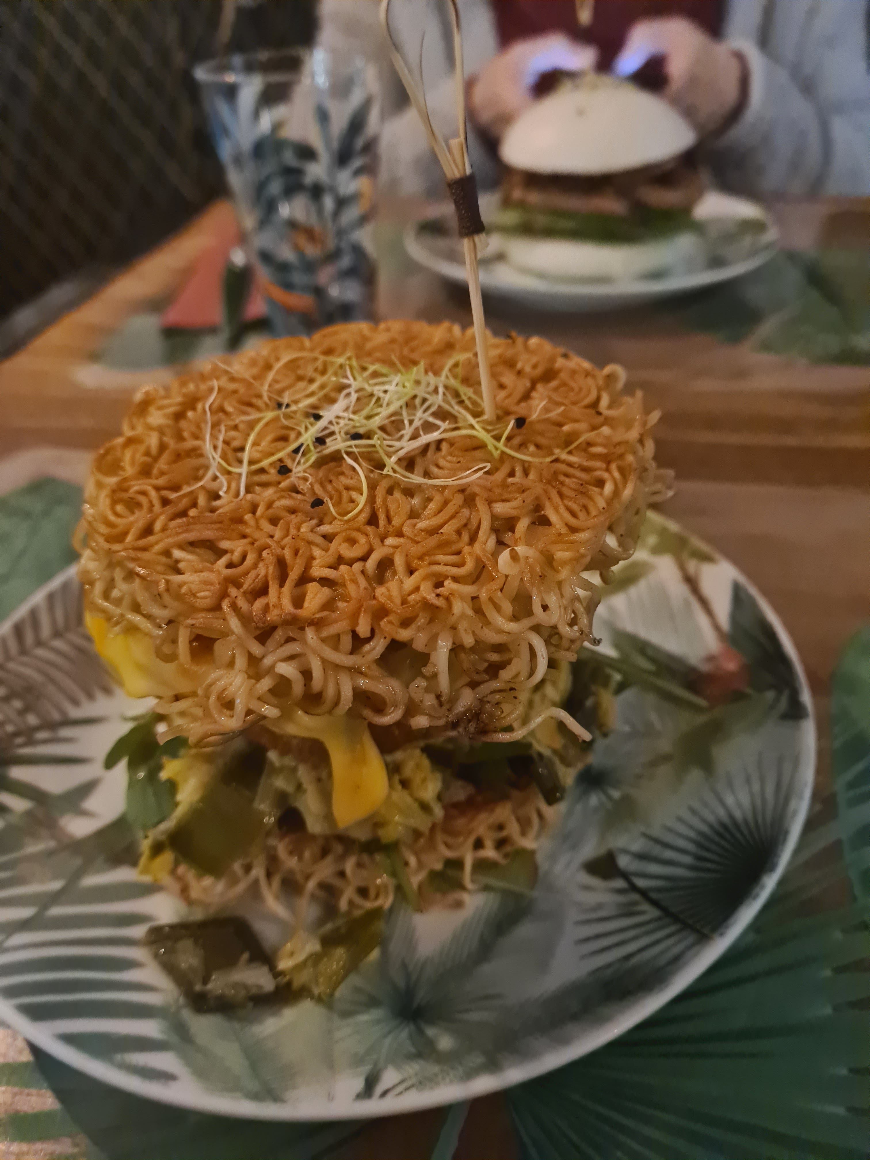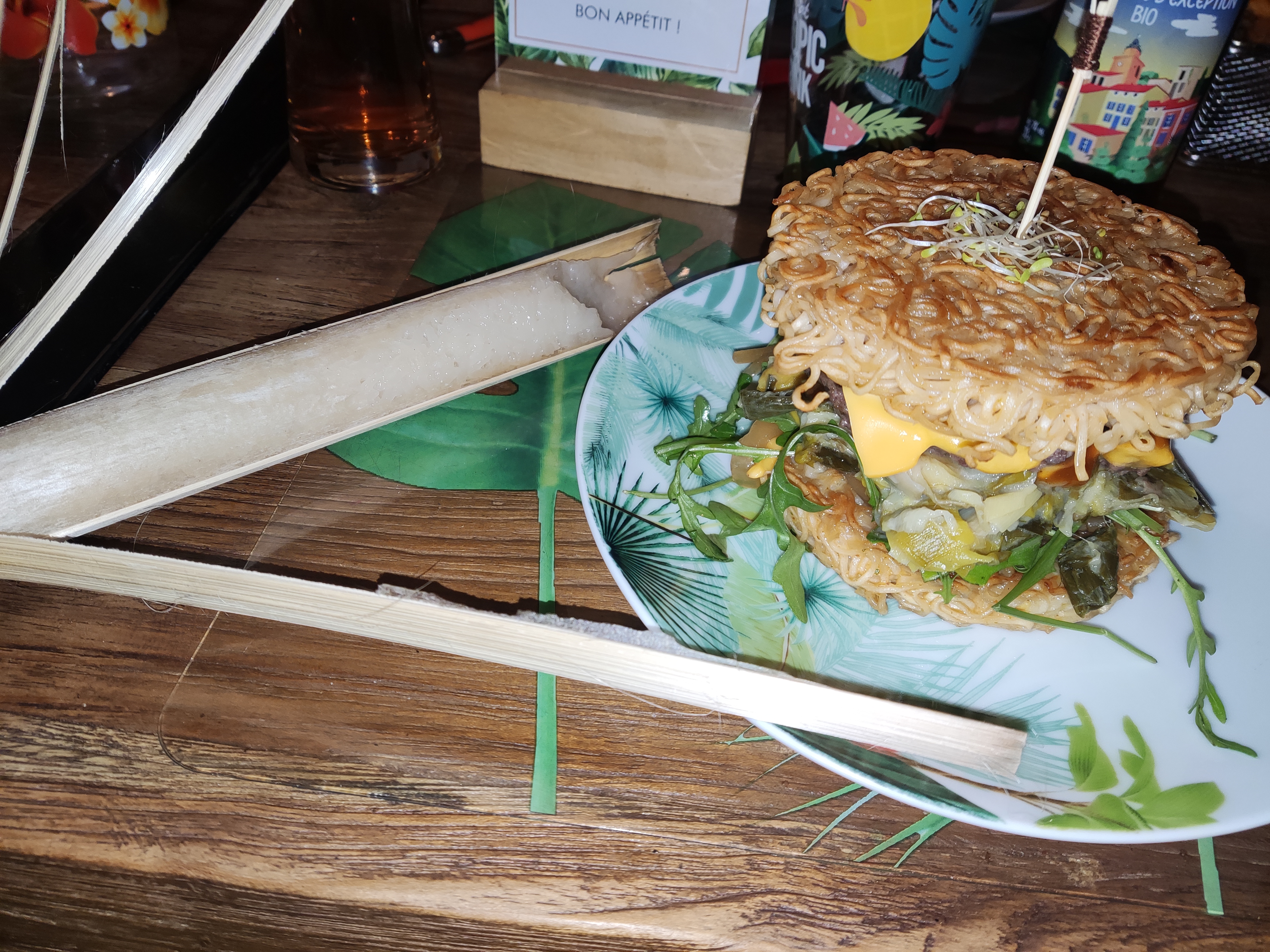 Vraiment très bon et très bien présenté, je n'hésiterai pas à revenir ! J'ai pris un ramen burger, les nouilles sont parfaitement cuites, elles sont moelleuses et en même temps croquantes c'est juste parfait. On sent très bien le goût et c'est ce qui était recherché ! Les frites sont faites maison, accompagnées d'une sauce curry mangue (plutôt bonne). Honnêtement, on prend du plaisir à manger dans une ambiance assez tropicale et on est calé ! Enfin, les serveuses sont très accueillantes et c'est agréable. Je recommande !