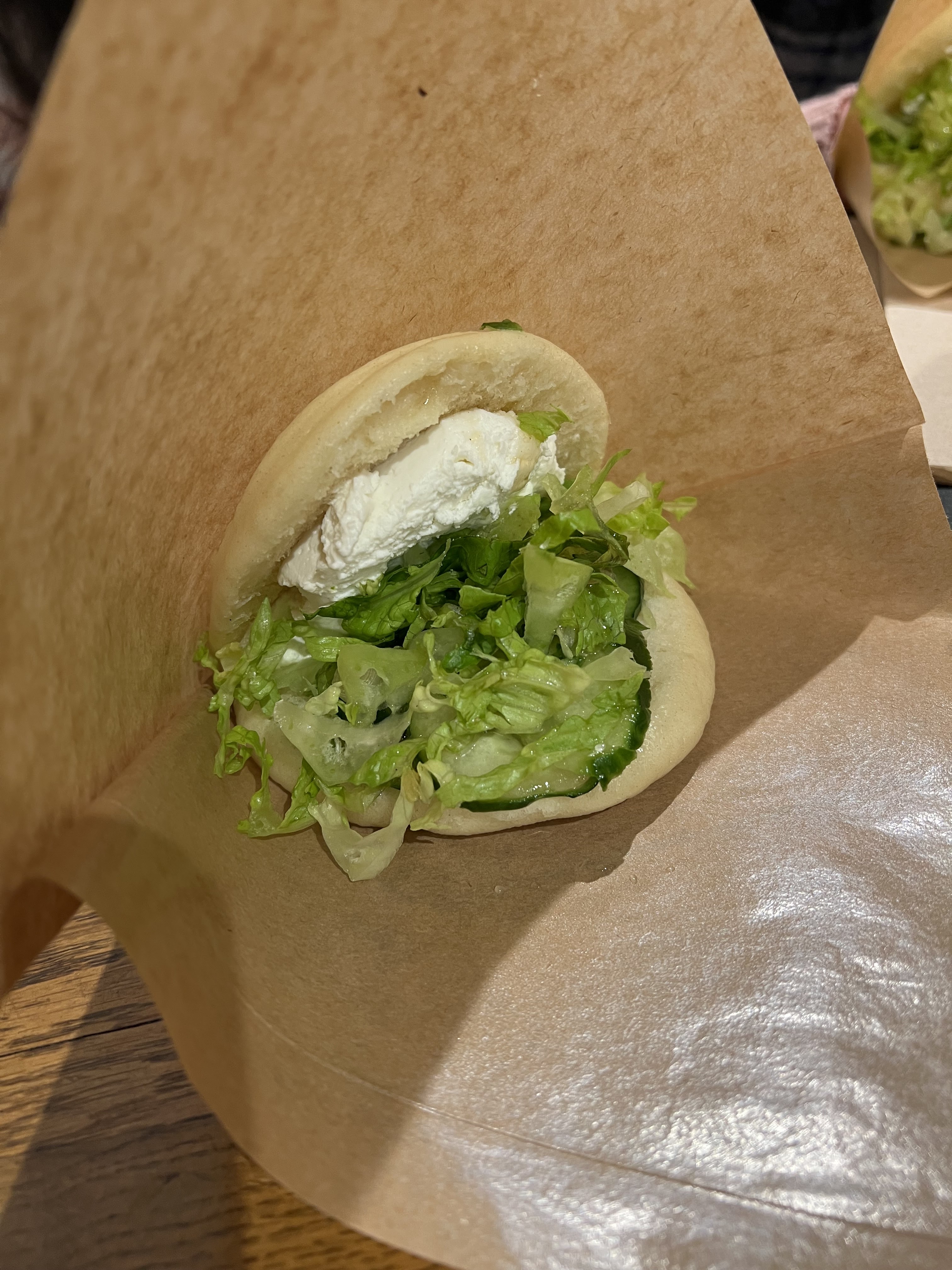 Brioche asiatique fondante et aérée super originale ! On a pris une planche de 6 baos à partager à 3 et trois salades pour 10€/personne aux Halles en terrasse en plein hiver : franchement très bon rapport qualité/prix ! Je recommande !