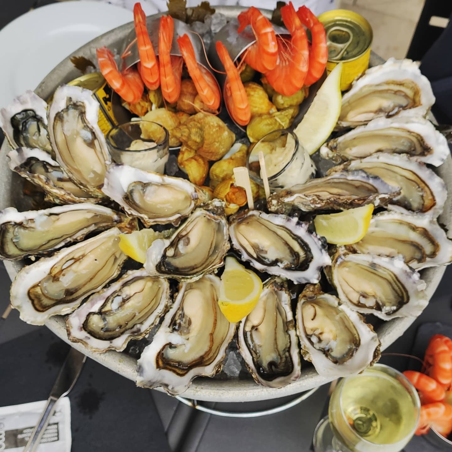 Huîtres et vin blanc mais aussi crevettes et bière blonde. Super moment. Super quali.