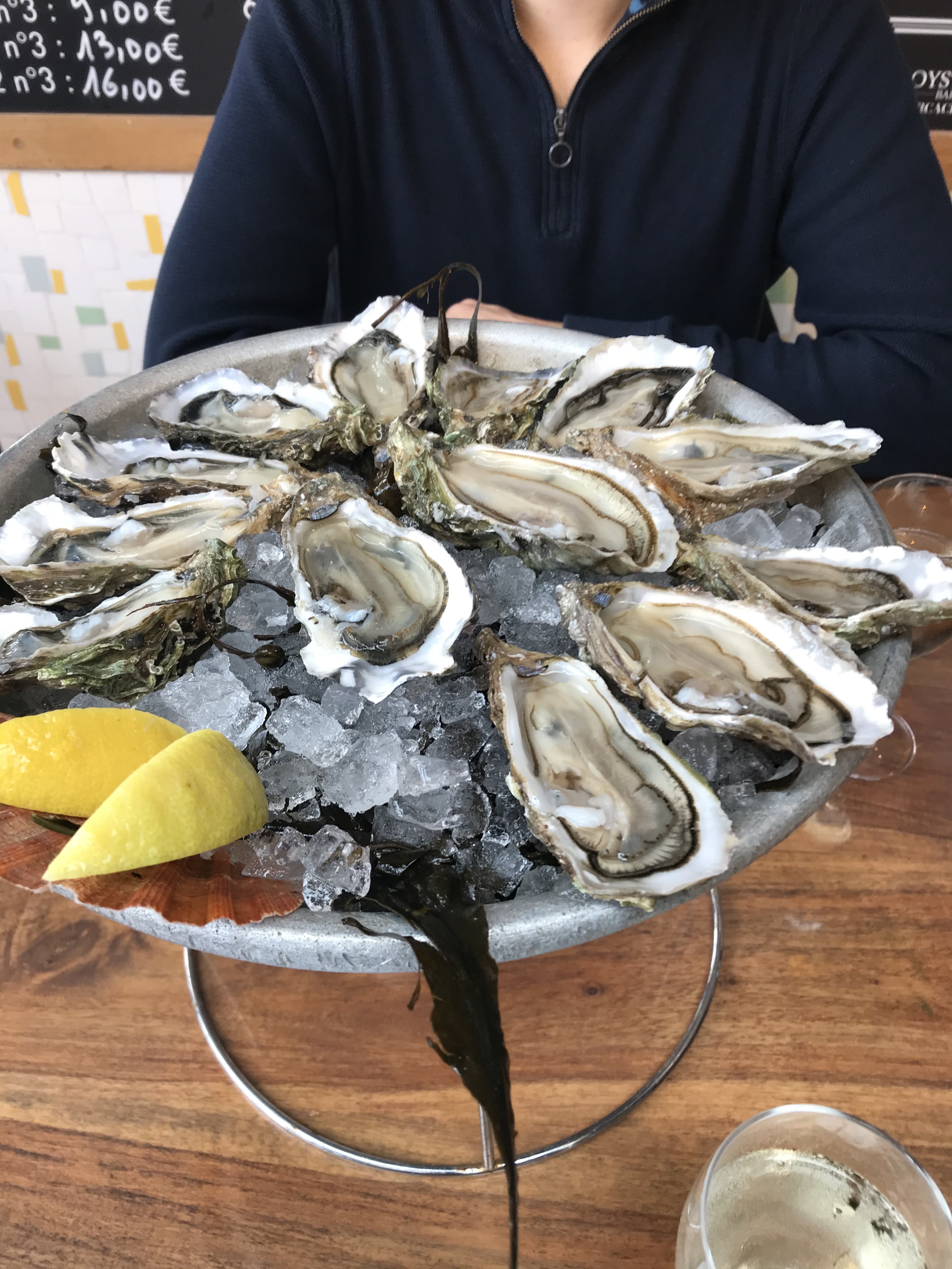 Des huitres nombreuses, des Gillardeau du bassin, des impératrices, des diverses.. avec un petit verre de blanc. Simple, superbe et le tout sous les halles et dans le marché local. Génial