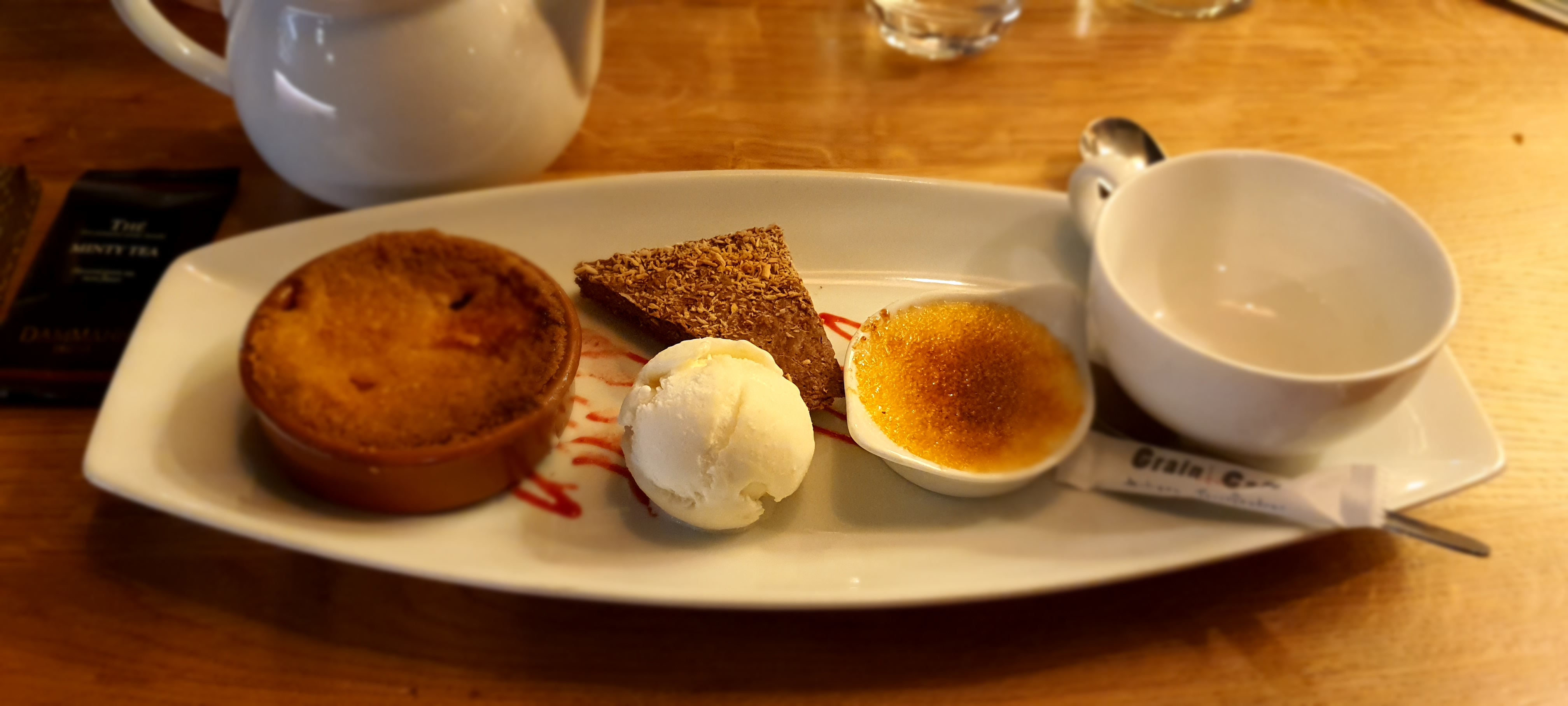 Déçue, on nous a servi le plat, du poisson avant le cocktail, le riz avec le poisson étant tiède, j’ai bu le cocktail avec le dessert. J’avais pris une crêpe qui n’avait pas l’air d’être faite maison. Pour avoir déjà déjeuné à la Place à Cancale, où c’était parfait, je ne retournerai pas à celui de Laval.