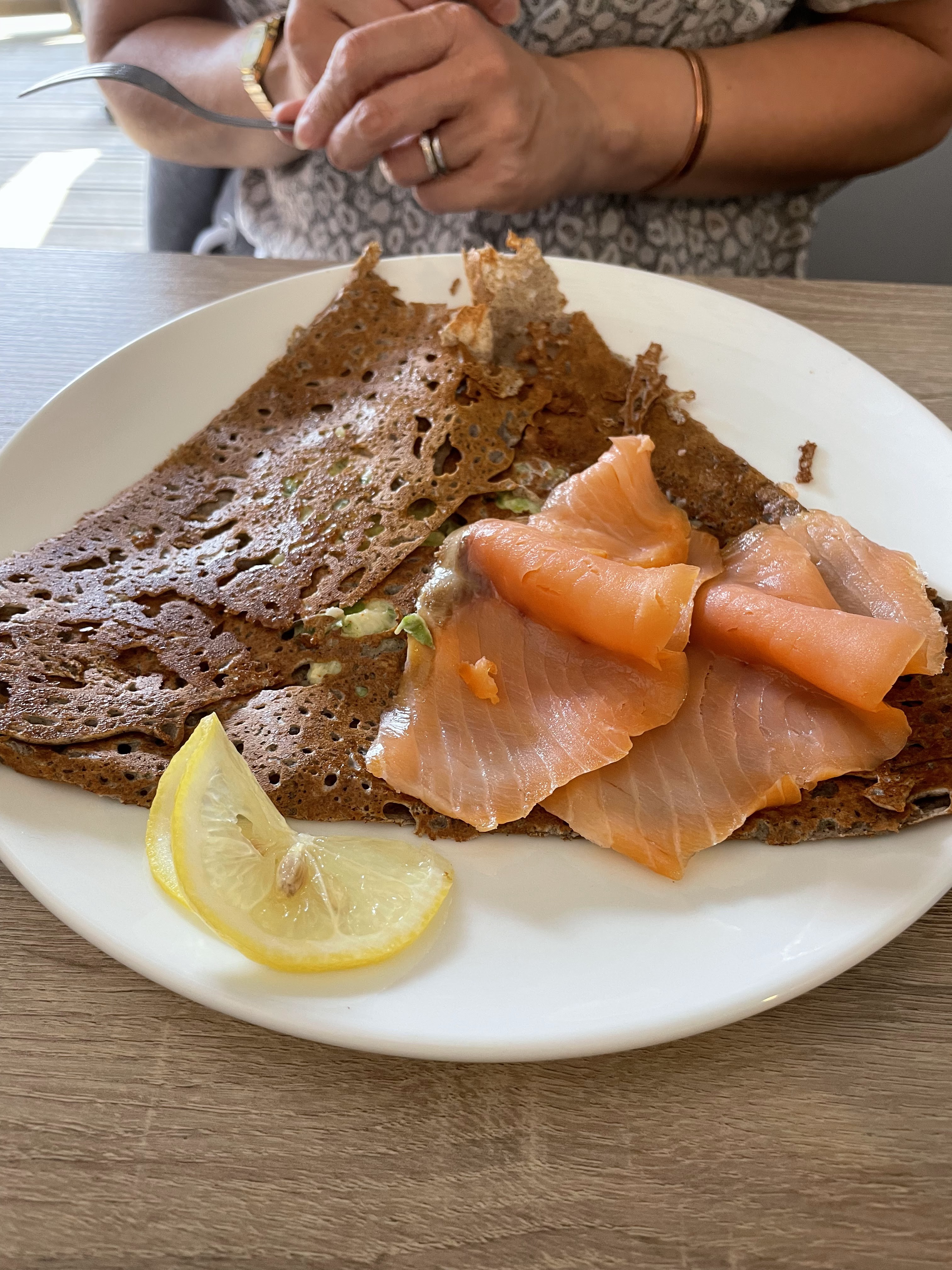 Bonjour , nous y sommes allés à deux. La serveuse est seule à servir , mais elle est d une grande gentillesse et à toujours le sourire même si elle court un peu partout. La cuisine est vraiment très bonne , nous avons pris une crêpe façon raclette , une crêpe batz ( saumon fondue de poireaux et 3 crêpes pour le desserts , Mr et gourmand ;). J ai mis 3 pour l ambiance car la terrasse et contre la route, et que comme la salle est petite il y a pour moi un peu trop de proximité. Mais ça ne nous a pas empêchés de passer un bon moment. Je recommande cette crêperie.