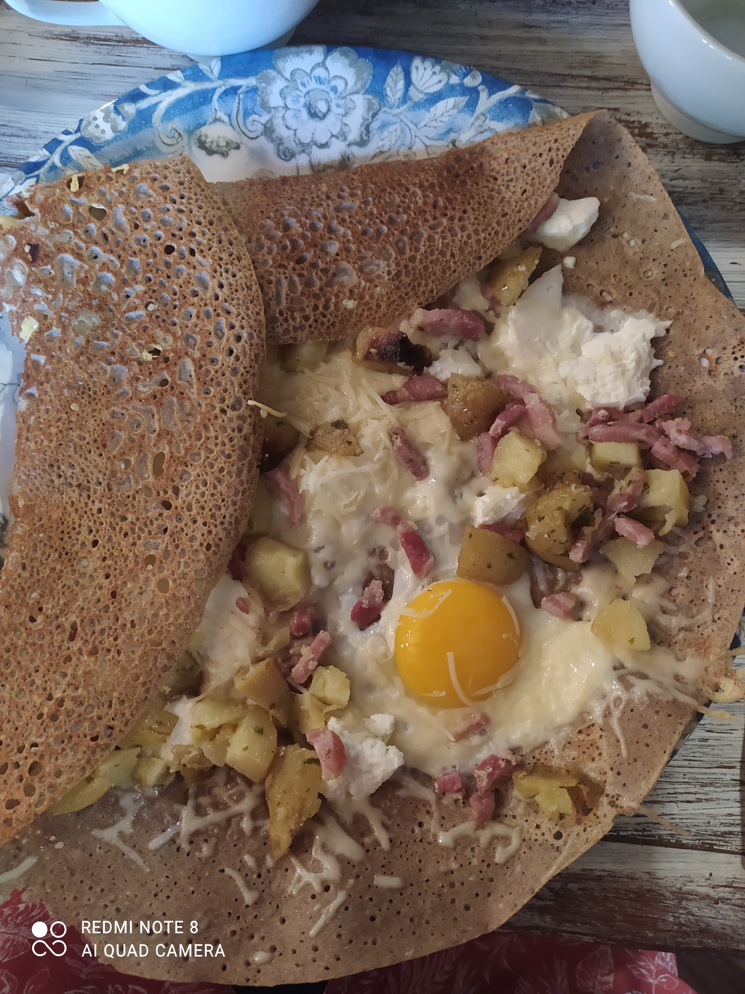 Crêpes du weekend en plus du menu. Dernière mise en œuvre : pommes de terre persillées, lardons, crème fraiche, jambon blanc. Un régal !!