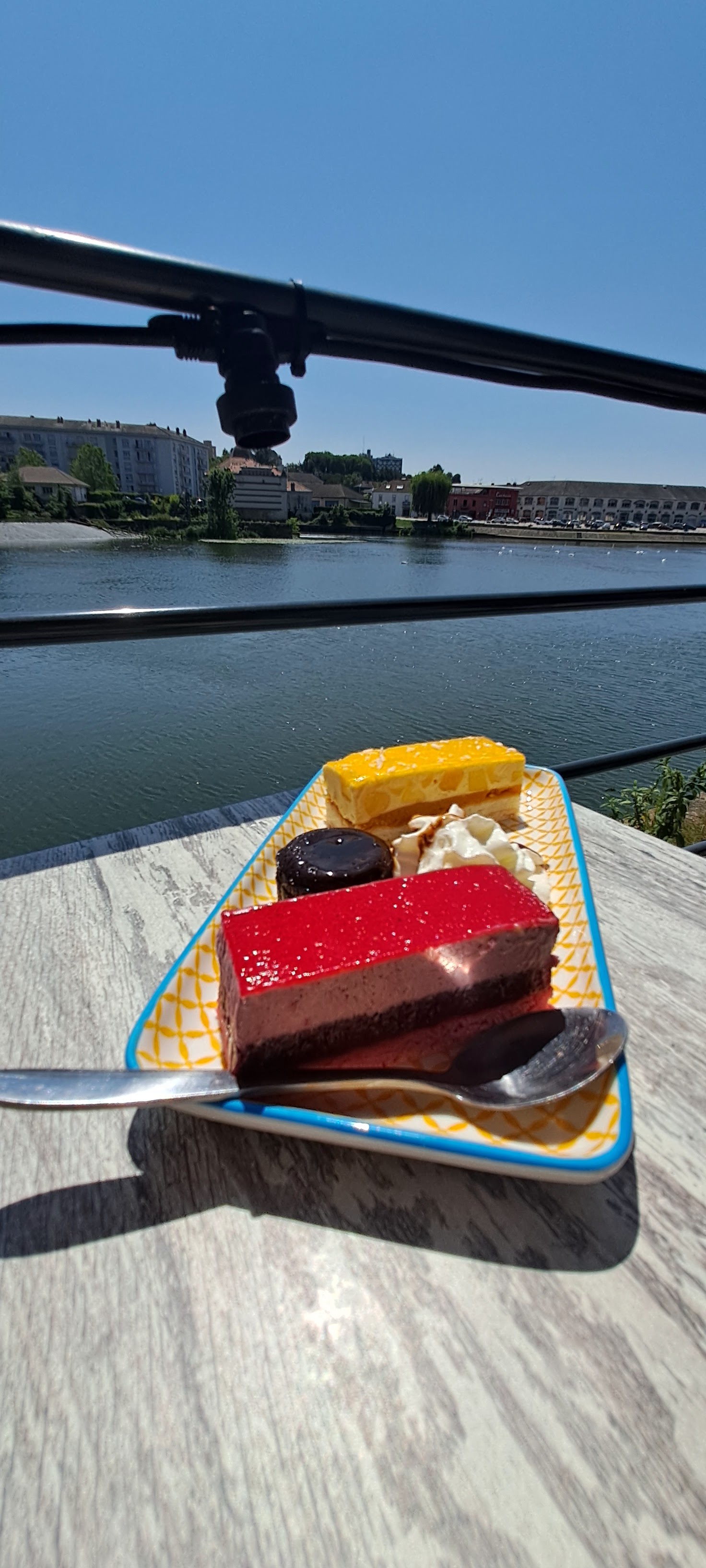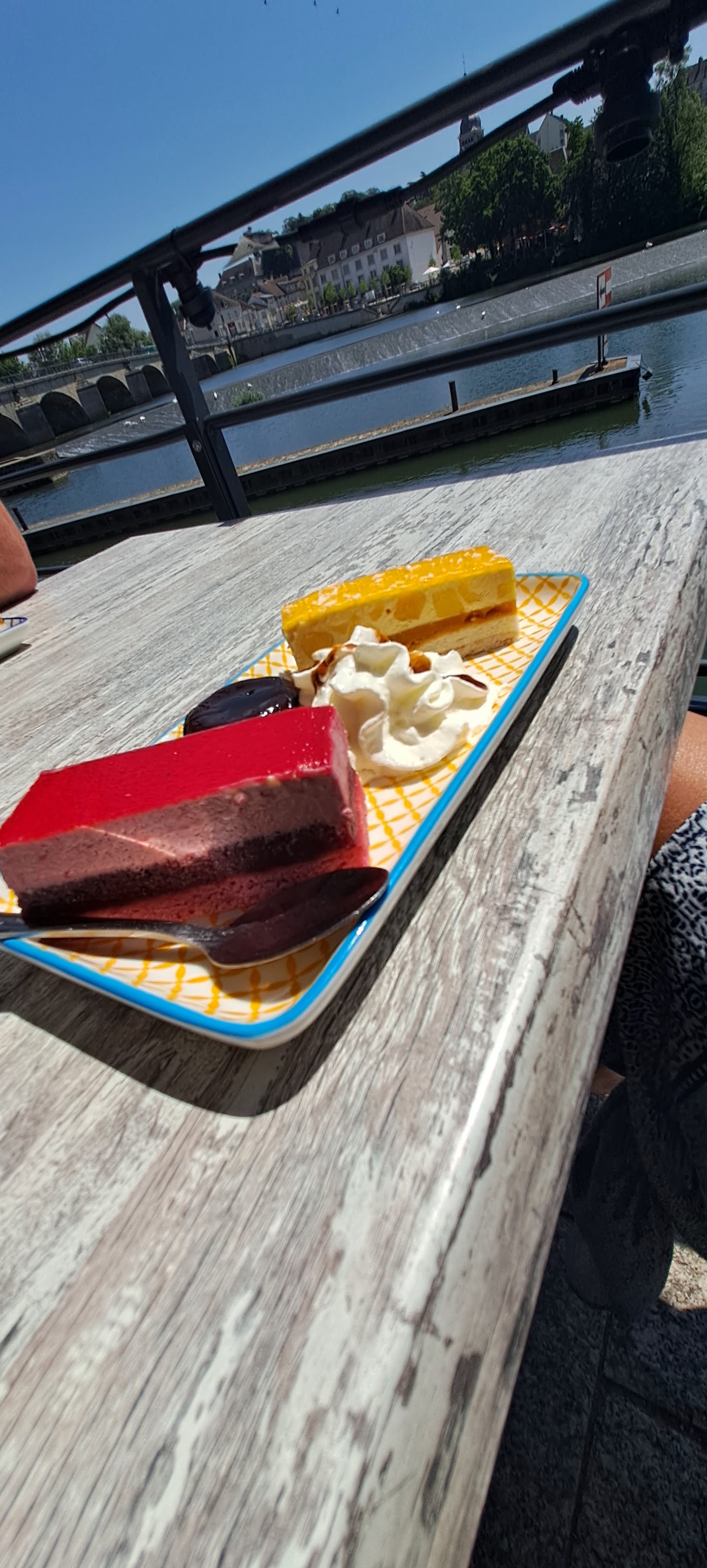 Super terrasse au bord de la Saône et de l'écluse,jolie vue sur le pont de Gray, soirée sympa repas Tapas,personnel accueillant,un moment de détente.