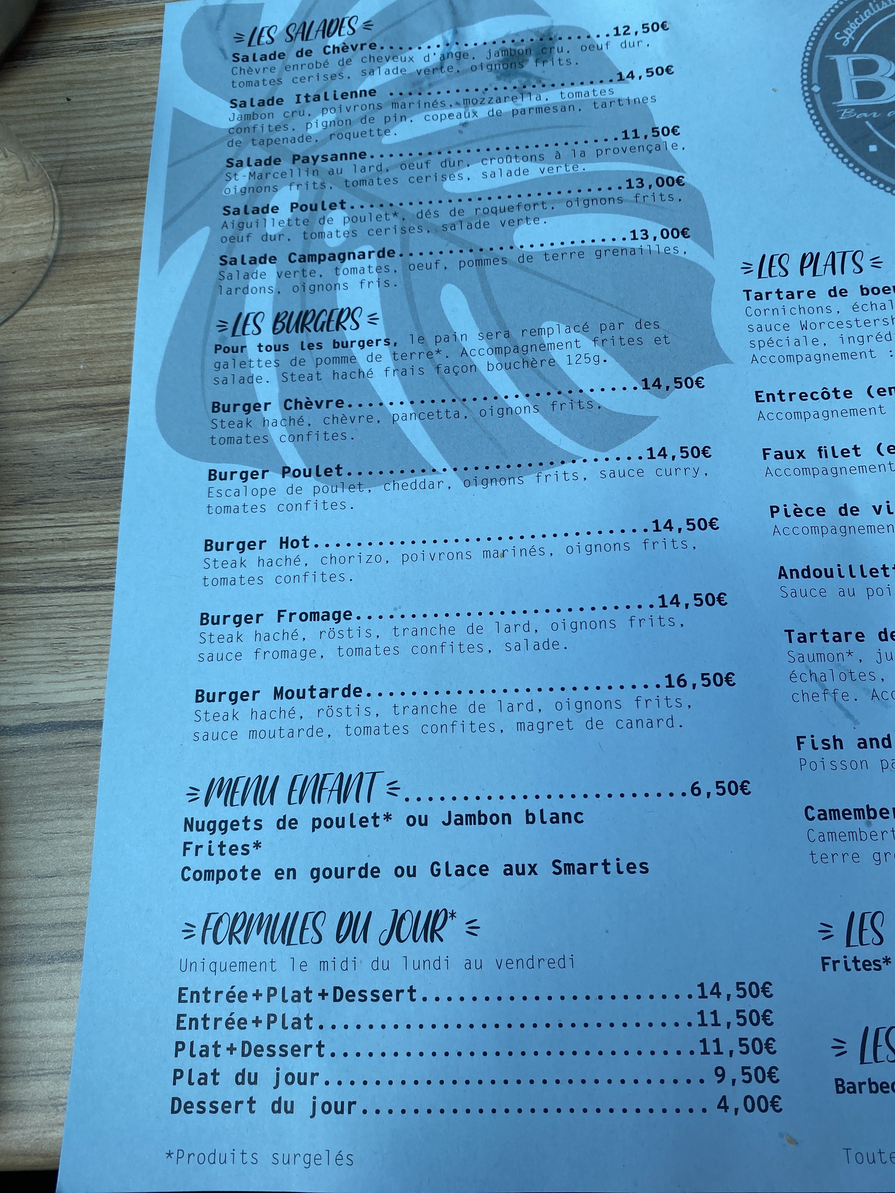 Déjeuner un midi. Service très moyen , il manque malheureusement pour eux du personnel. Ambiance : bof , serrés sur de petites tables. Cuisine : rapide, simple, prix correct. J ai dû demander de faire fondre le camembert ...qui était censé être fondu ! Sûrement plus sympa pour l ambiance en terrasse au soleil.