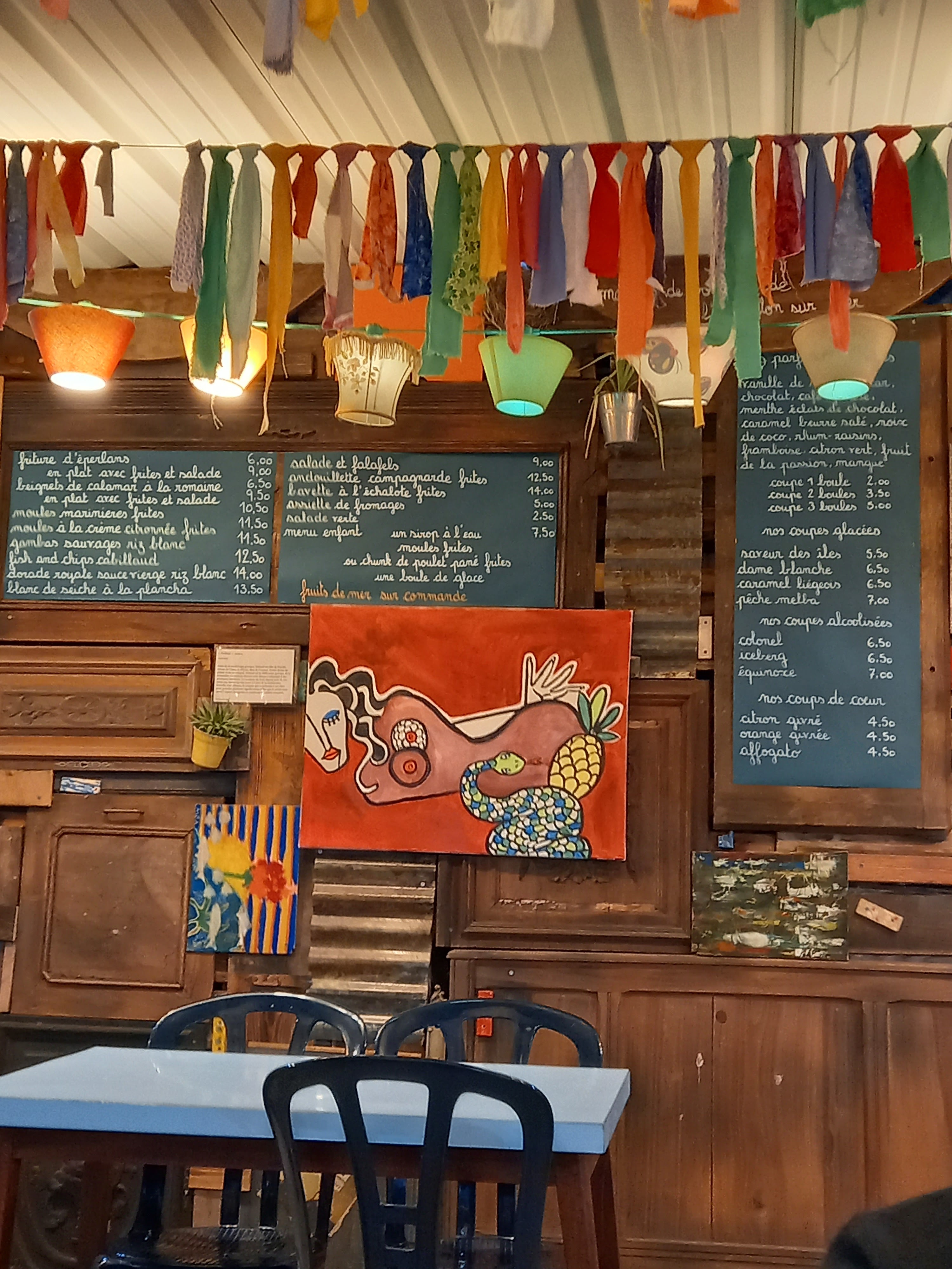 L'artiste, le copain au p'tit bateau, m'avait parlé d'1 bar coloré où il expose qls créations ●A absolument découvrir●La vie fait qu'on aime les gens pour leurs différences, qu'on les quitte aussi parfois pour ça, qu'ils nous captivent par leurs originalités (ou bizarreries), et nous effraient souvent pour les mêmes raisons, pourtant le talent provient bien de ce qui nous distingue, de notre manière spéciale de voir, d'exprimer, de comprendre et de penser.Cet endroit《📌ME PLAÎT BEAUCOUP📌très convivial, étonnant et chaleureux, la jolie Claude, son équipe et le ♡ toutou, nous y accueillent. Belle découverte, ici chacun se salue et discute 1 instant, très appréciable pour les longues journées d'hiver. Merci pour votre gentillesse.