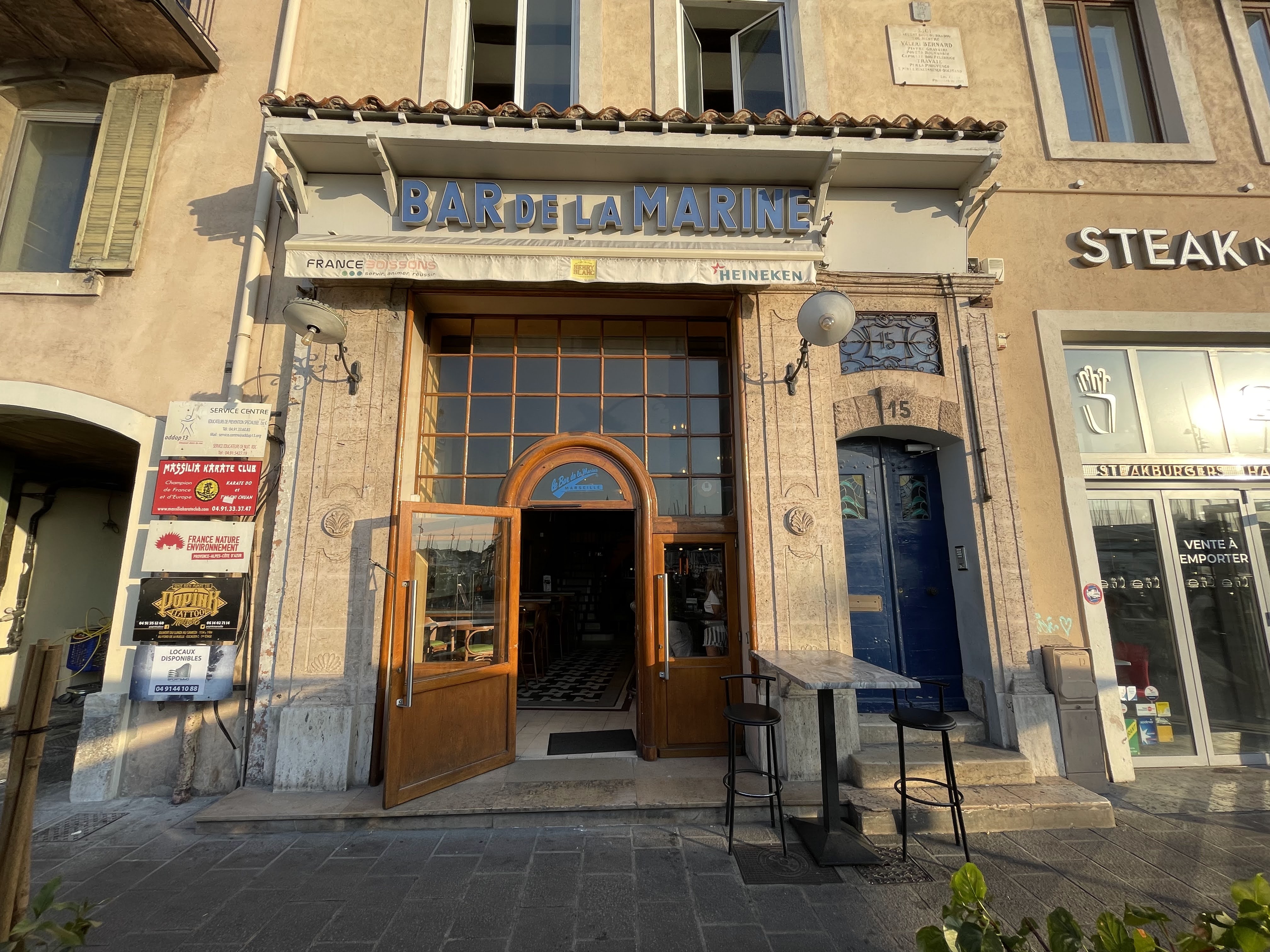 Faut-il encore présenter le cultissime Bar de la Marine ? Si ça vous dit rien, partez de Marseille illico presto. Personnel polyglotte 🇨🇵🇮🇹🇪🇦🇺🇲🇬🇷🇧🇷🇧🇦🇨🇱🇹🇷🇩🇿🇦🇱🇲🇦🇹🇳🇷🇺🇨🇳. Lucile amour et rock'n'roll en matinées . Gabriel l'archange 🇧🇷 en soirées. Mr Lantieri ancien joueur de l'US Endoume Catalans en séance de dédicaces tous les midis. Que faut-il rajouter ? Moi le prolétaire je me fais plaisir ici. Cuisine de très haute volée. Matchs de l'Olympique de Marseille retransmis en direct live. Ici le PSG on ne l'adule pas. Allez une mauresque à la santé de Marius, Fanny et César. With love. Dimitri le fada 🤪
