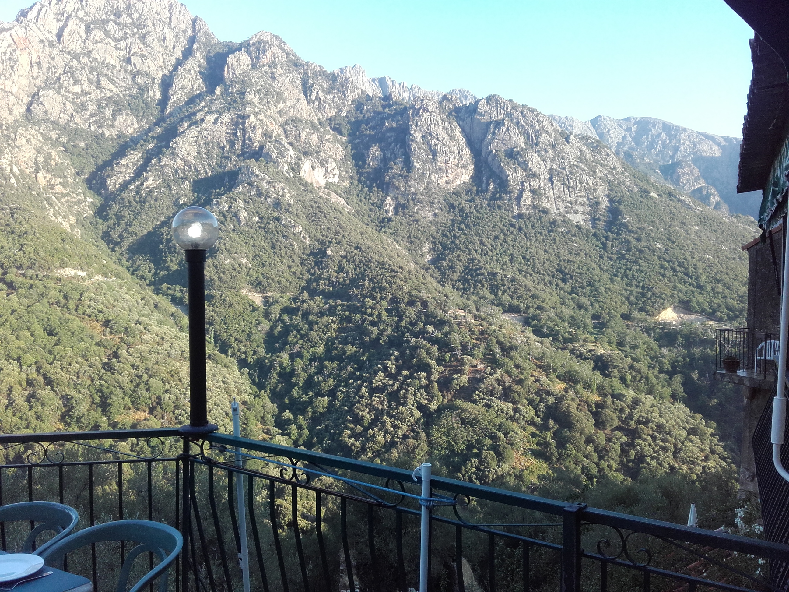 Restaurant dans le village de Ota typique corse avec civet de sangliers, daube de veau et agneau, plats traditionnels de la région. Terrasse avec vue sur la vallée et le village.