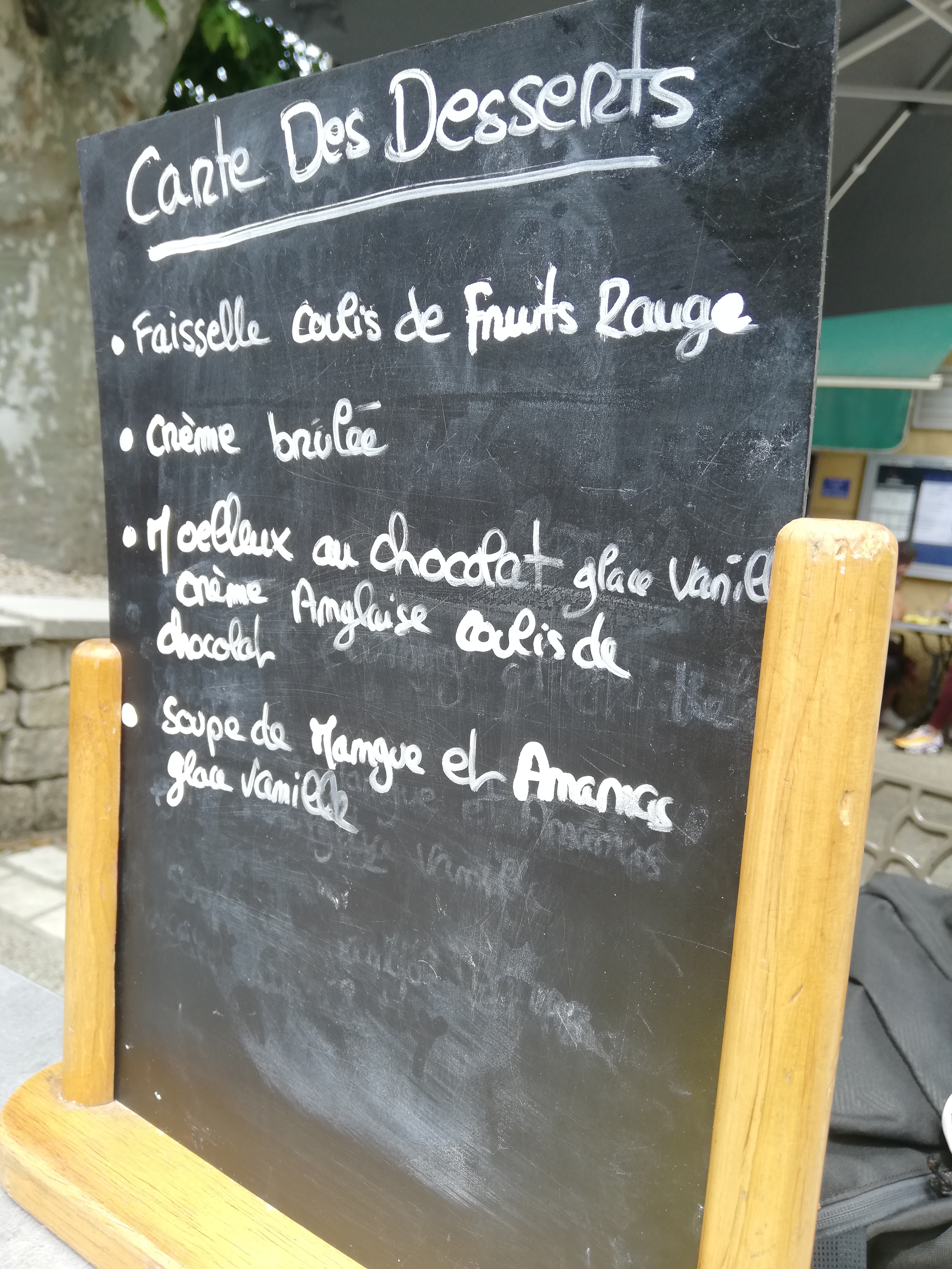 Menu plat dessert le soir avec 3 choix de plats, pour nous hampe de boeuf : cuisson bleue bien maîtrisée, bonnes frites. Choix de desserts maison ou glaces. Pour nous crème brûlée excellente et moelleux au chocolat avec glace vanille très bon aussi Accueil sympa, il faut juste savoir que le patron travaille parfois seul, donc il ne faut pas vouloir manger vite mais prendre son temps sous l'ombre des platanes