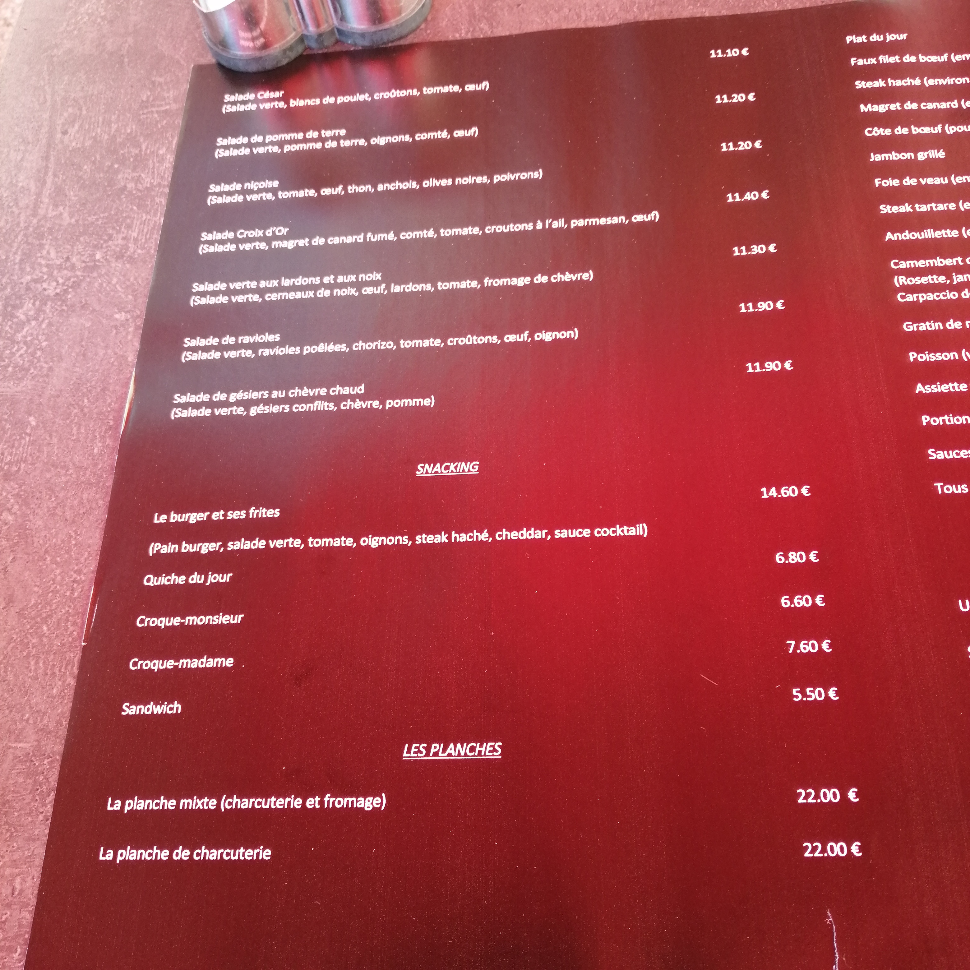 13,80E un sois-disant pavé de boeuf dur comme du chien.Un rosé dégueu.... en pichet (16 euros le litre) servi tiède. Le sourire de la serveuse devait être en supplément...A fuir.