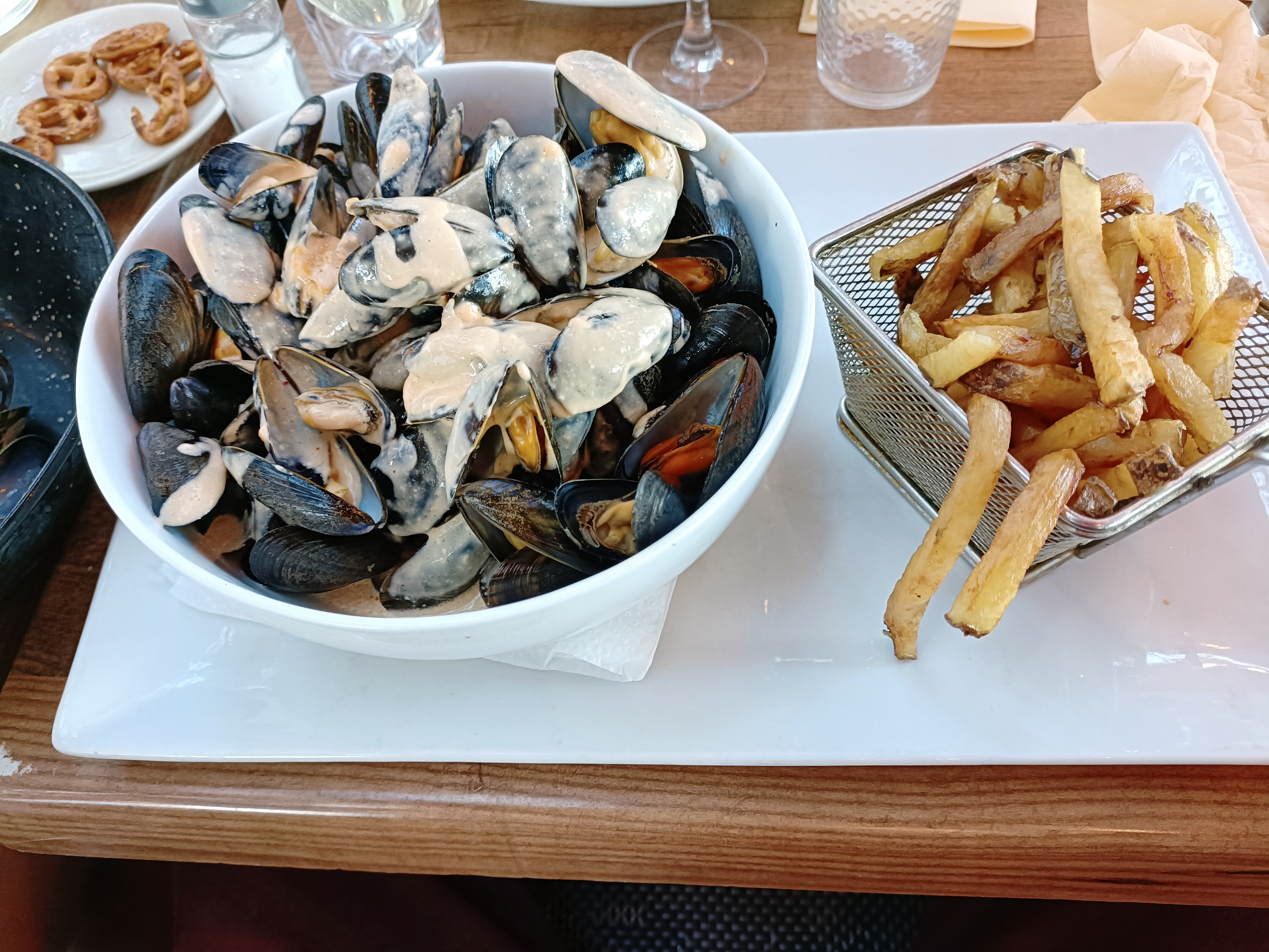 D'abord nous choisissons à l'intérieur car mauvais temps, et là une odeur nauséabondes de remonté d’égout. Ce serra donc dehors... Heureusement serveur compréhensif et nous met les parasol chauffants. Moules assez bonnes mais sans plus, frites moyennes et dessert probablement surgelé. Serveur sympathique mais repas passable.