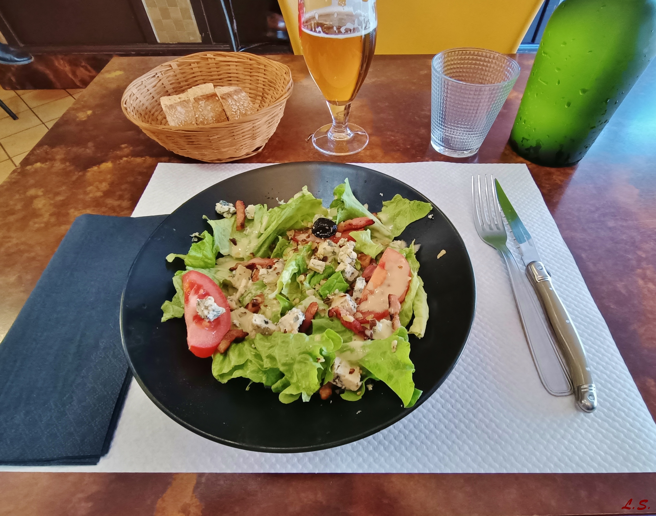 Ce bar qui fait restauration propose le samedi un menu à 26 euros,entre autres formules;le service est assuré dans une salle étriquée attenante au bar et la vue donne sur la terrasse,elle-même donnant sur la rue.Le décor est sommaire et un fond sonore arrive dès le midi (pour égayer l'ensemble?!).Les plats sont assez généreux pour le prix,mais les frites industrielles et la sauce forestière trop liquide pour être maison gâchent un peu le plaisir,de même que les deux fines tranches de fromages secs et les trois tranches de pain dénottant un souci d'économie.La tarte aux pommes (tranche) manque d'imagination (boule de glace ou crème fouettée).Bref:juste une halte pour se sustenter avant de repartir apprécier la campagne environnante.