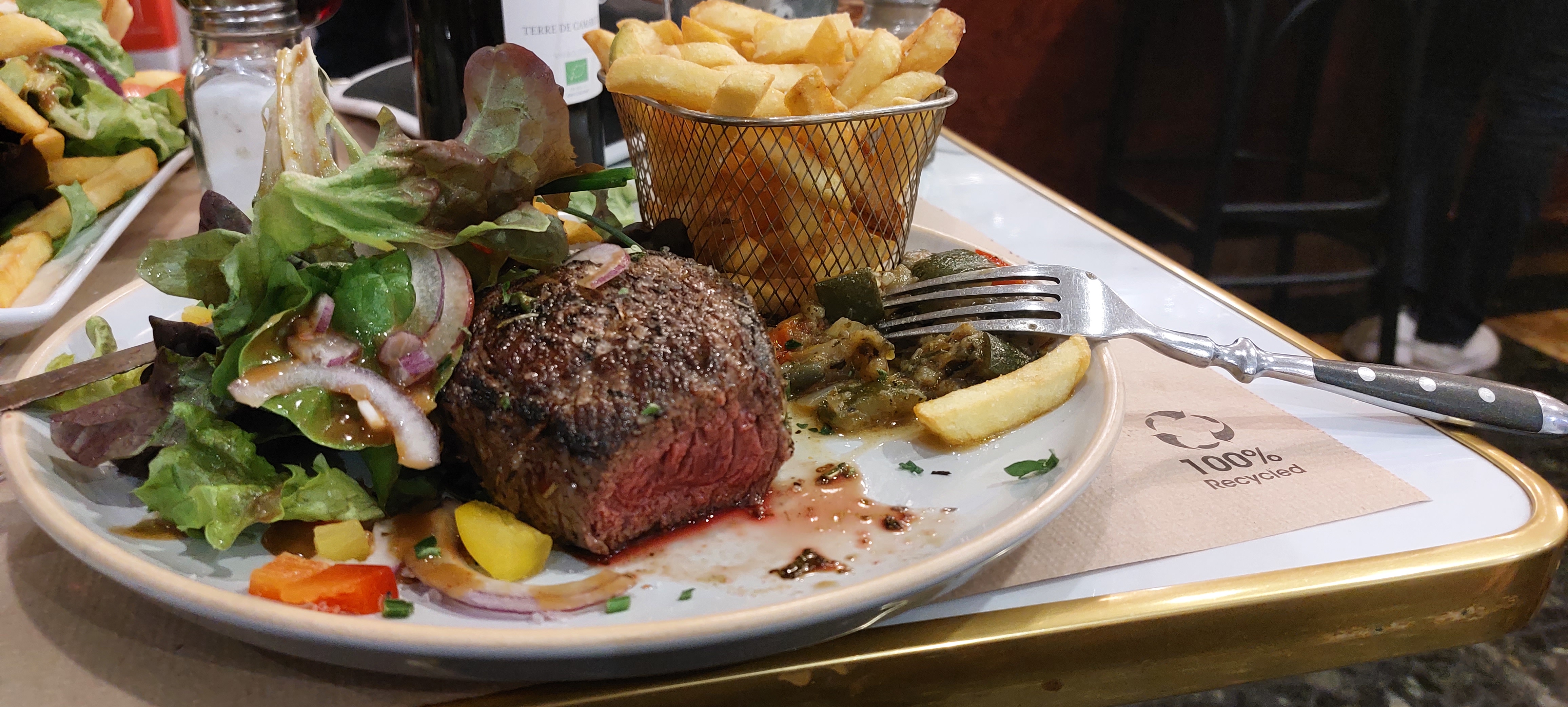 Accueil sympa.. Hormi les frites congelé petit prix bon prié un tatare viande ok du demande serviette et sauce pour le tartare..c est un détail ah une salade bio serait mieux et les tomates...