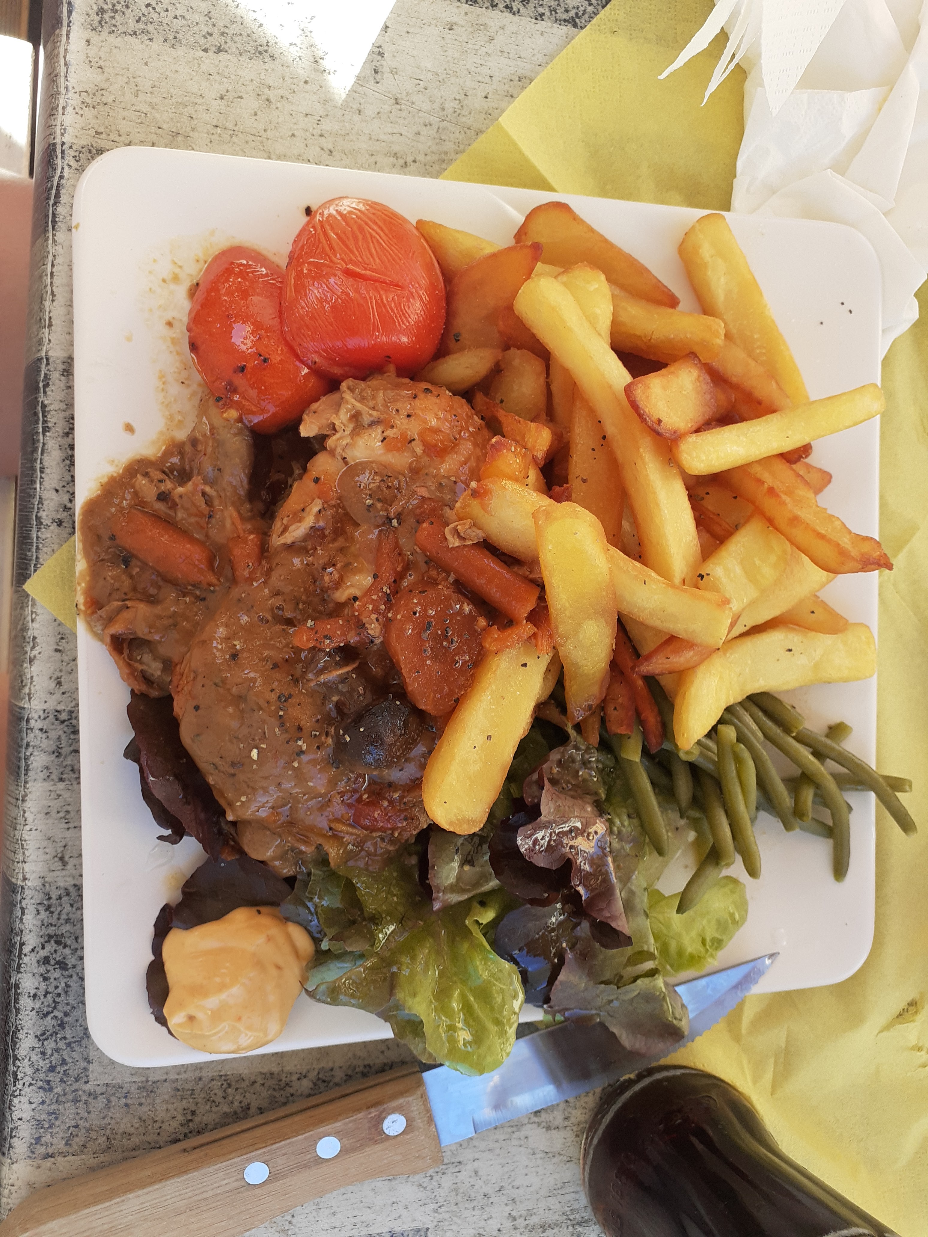 Que dire! Pas de carte à table donc pas de prix affichés (il y a bien une affiche extérieure mais pas de correspondance avec les bons tarifs), choix juste entre 2 plats, on demande 2 types de cuissons tout arrive à l'identique, l'accompagnement c'est tout ou rien, haricots vert à la flotte, les frites pas trop mal, la pièce de boeuf dure (je suis fils de boucher et franchement mon père ne l'aurais même pas mangé!) Le tout accompagné de moutarde dans l'assiette alors que je ne supporte pas ce condiment. Ah si la carafe d'eau était fraîche... Désolé mais pour ce tarif, dommage qu'il n'y avait pas de kebap sur l'île j'aurais mieux mangé.