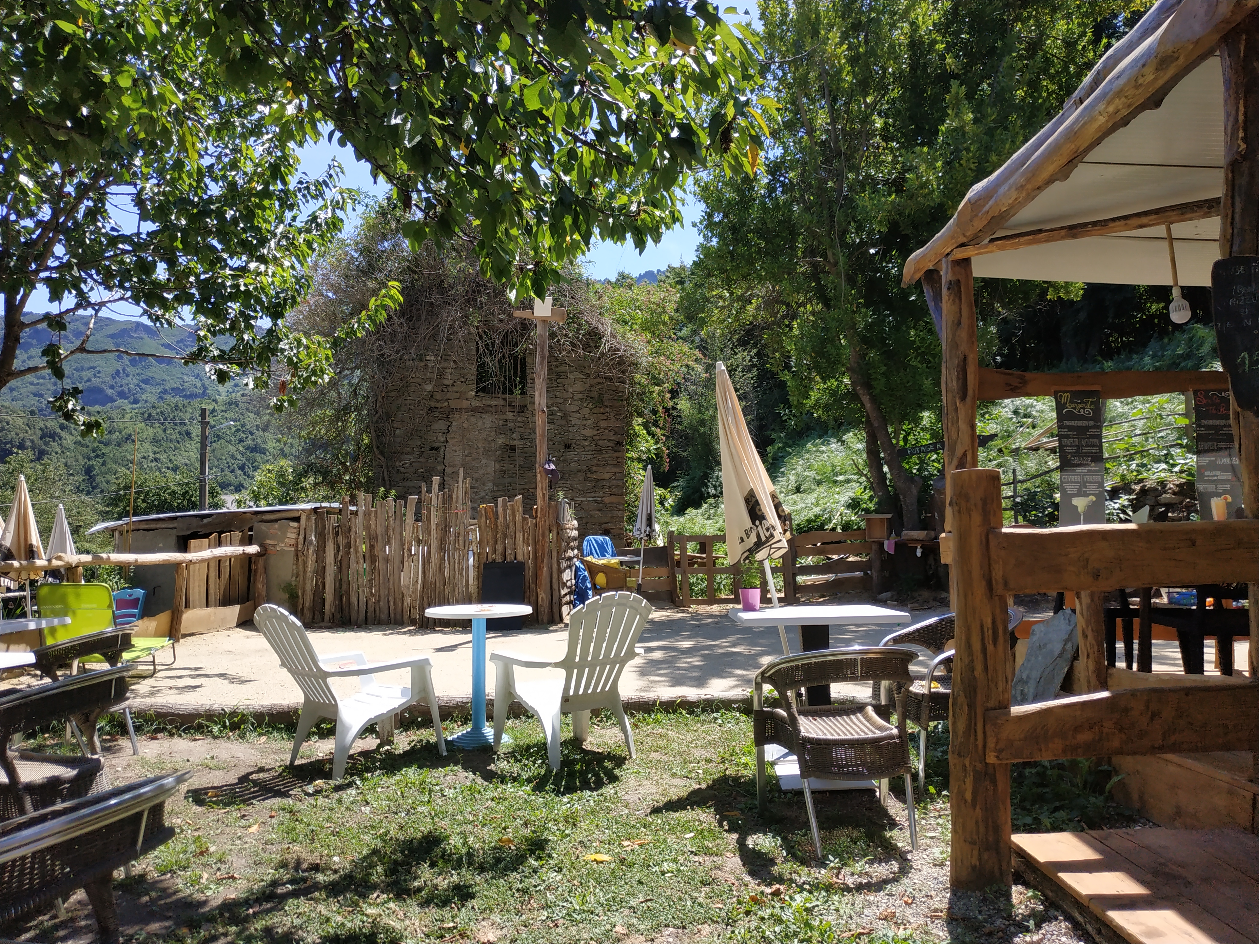 Un petit coin de paradis sous les arbres dernière un potager. La patronne cuisine les plats Corse elle-même et tout est délicieux. Les enfants sont même allé chercher des tomates cerises dans le potager pour l'apéritif.