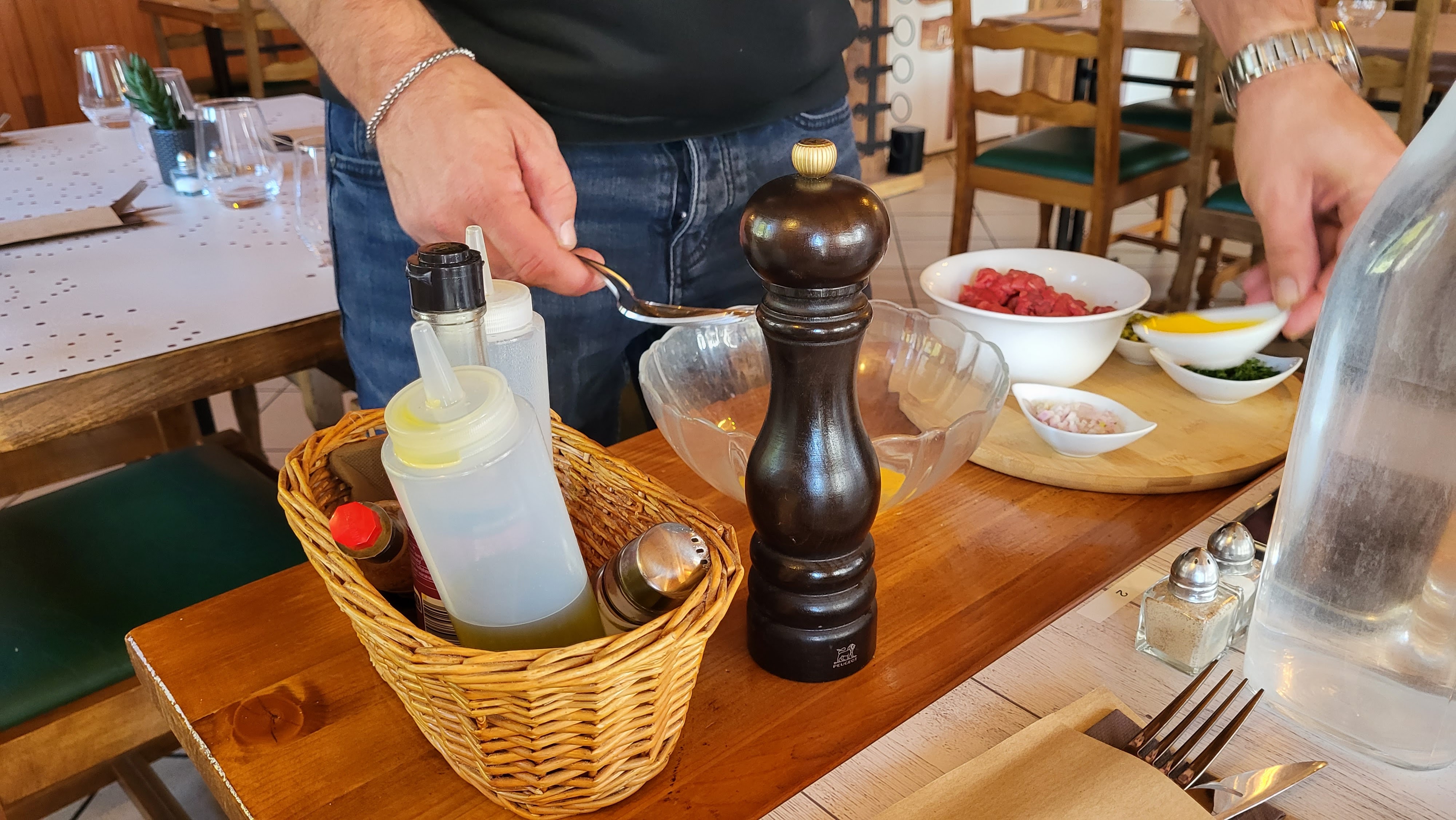 Tartare coupé au couteau, préparé devant vous, assaisonné comme on veut. Les plats sont bons et copieux, frites sympas et la p'tite salade agréable, seul p'tite fausse note le rosé en carafe à 30€/litre.
