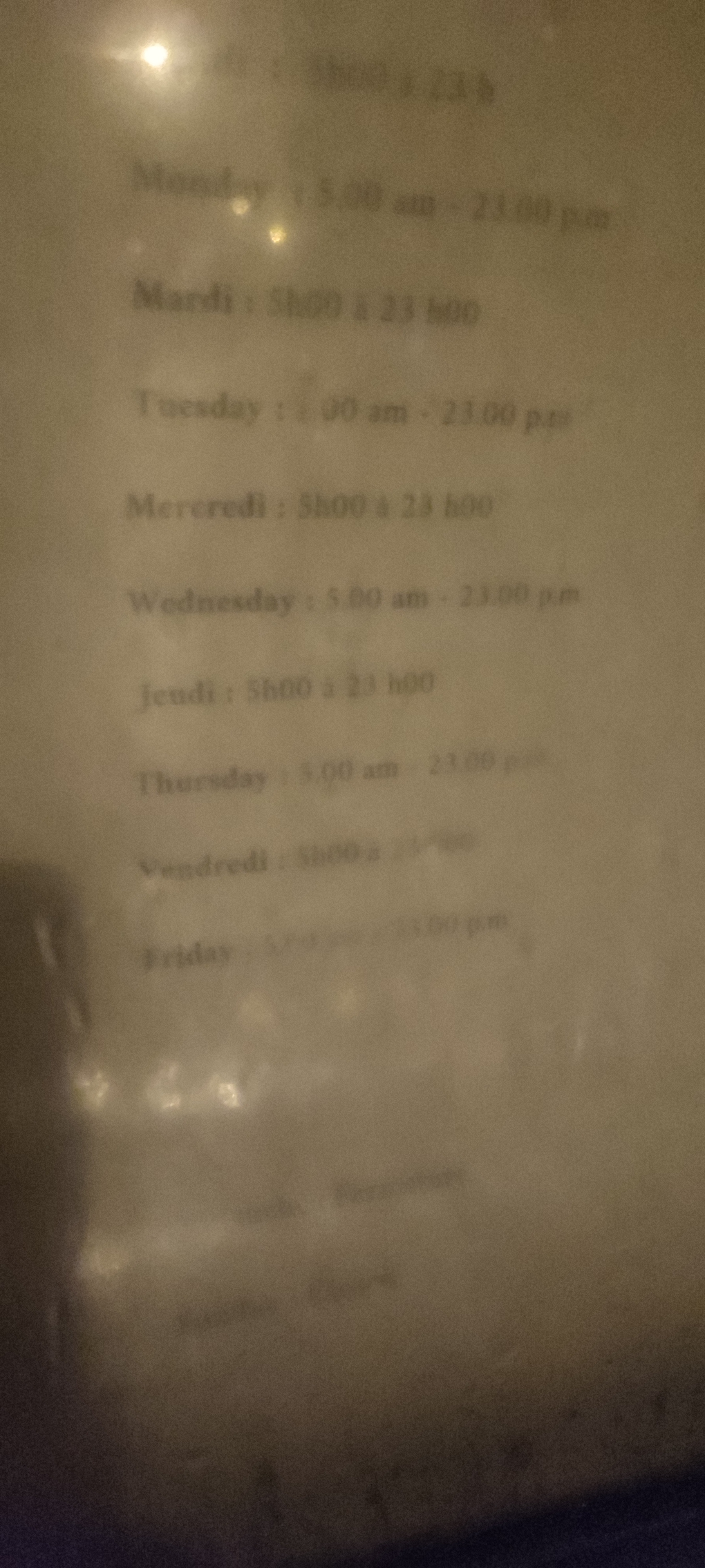 1 étoile par obligation. Sur la façade vous trouverez une affiche avec les horaires et même en anglais vous voyez le niveau. Ouvert du lundi au vendredi de 5h a 23h30..... hé bé non pas le vendredi. Vous faites déplacer les gens pour rien... Ce n'est pas très professionnel.