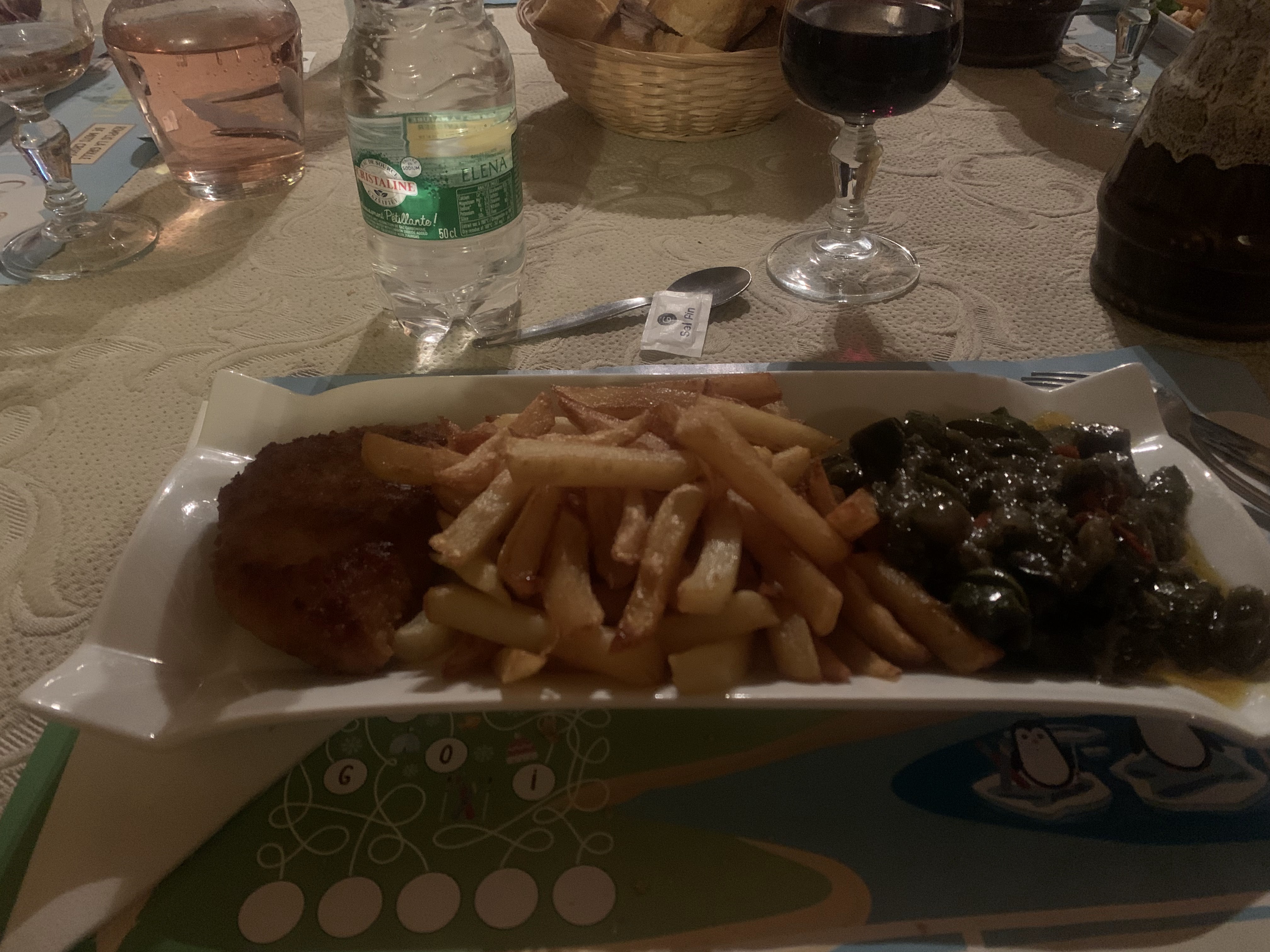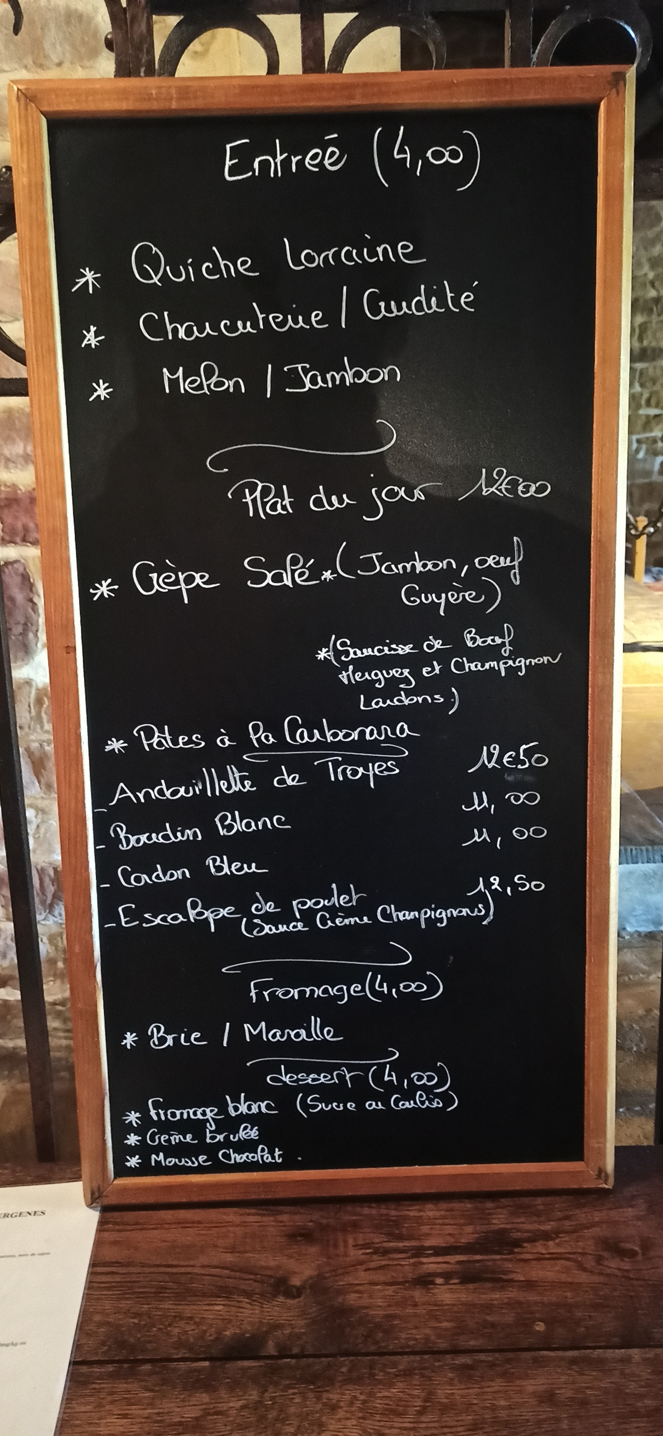 Très décevant pour ma part ! J’ai pris une assiette de charcuterie en entrée (j’ai eu l’impression d’être à la cantine … charcuterie sans saveur et mal présentée ) Et boeuf bourguignon , frite , salade (donc déjà plus de salade … étonnant quand même …) et frites mal cuites … Bourguignon pas exceptionnel non plus Déçue du repas …