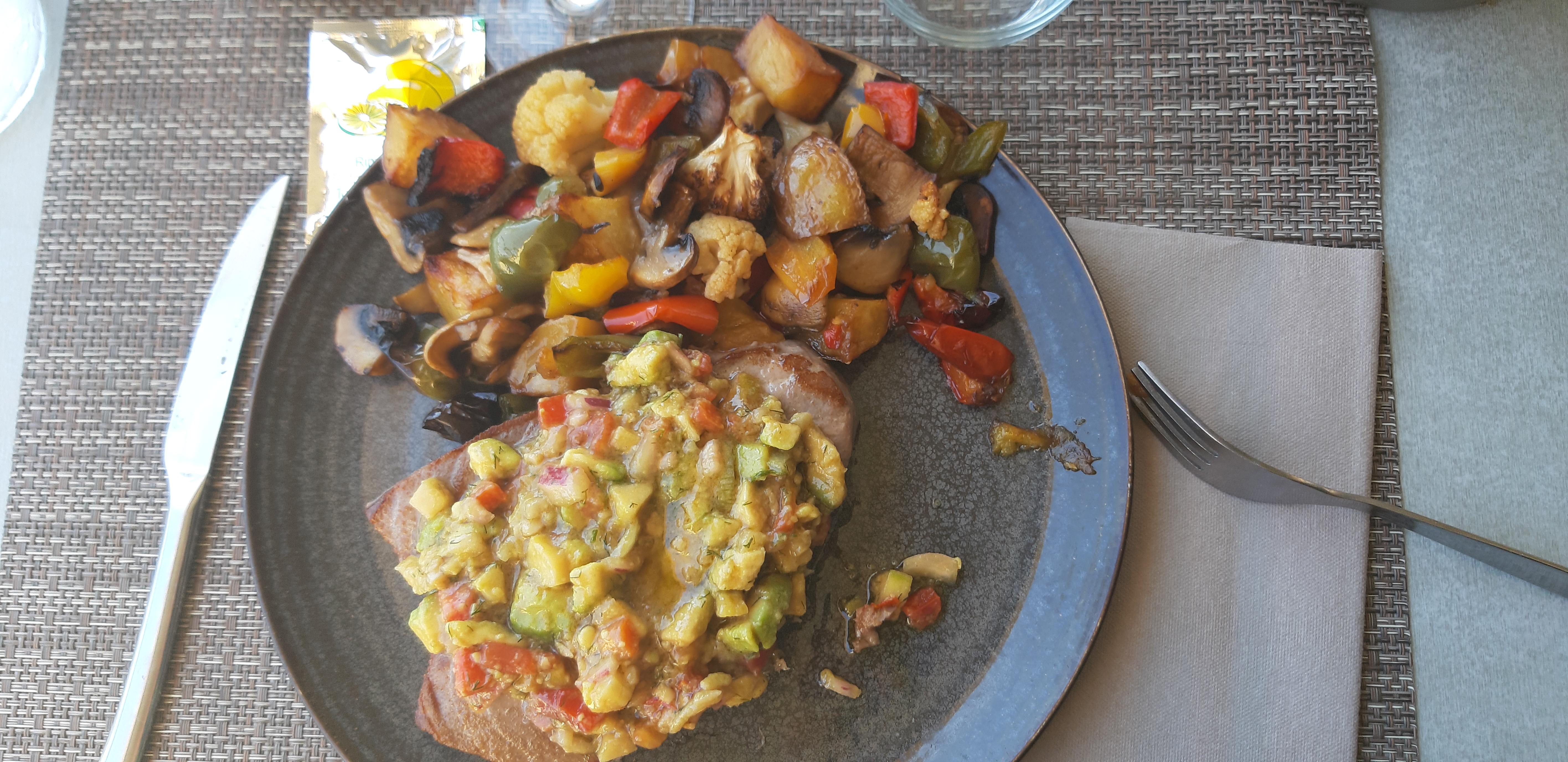 Filet de saint pierre et ses petits légumes. Un délice. Super bien cuisiné. Au pied de la tour de campomoro pour une petite balade digestive.