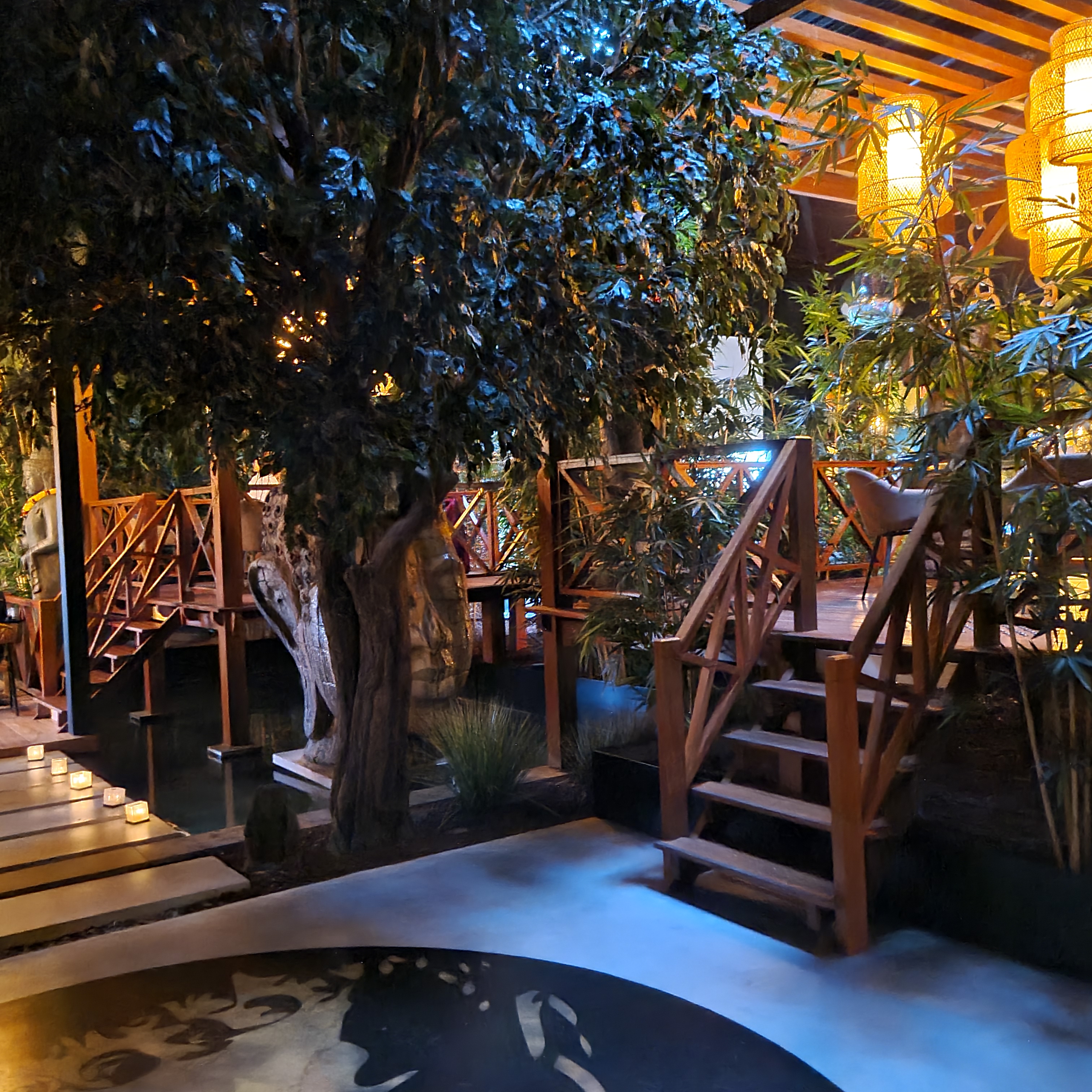 beau décor, dans les plantes. 1 salon ambiance. avec bar. 1 boutique. des niveaux. 1 dj. le service est très rapide. 3 choix de wook poulets, boeuf, fruits de mer. hamburger. le prix $$$. bien pour une soirée à thème. plus sur d avoir de la place sur réservation. dessert nems banane coco, sympa.