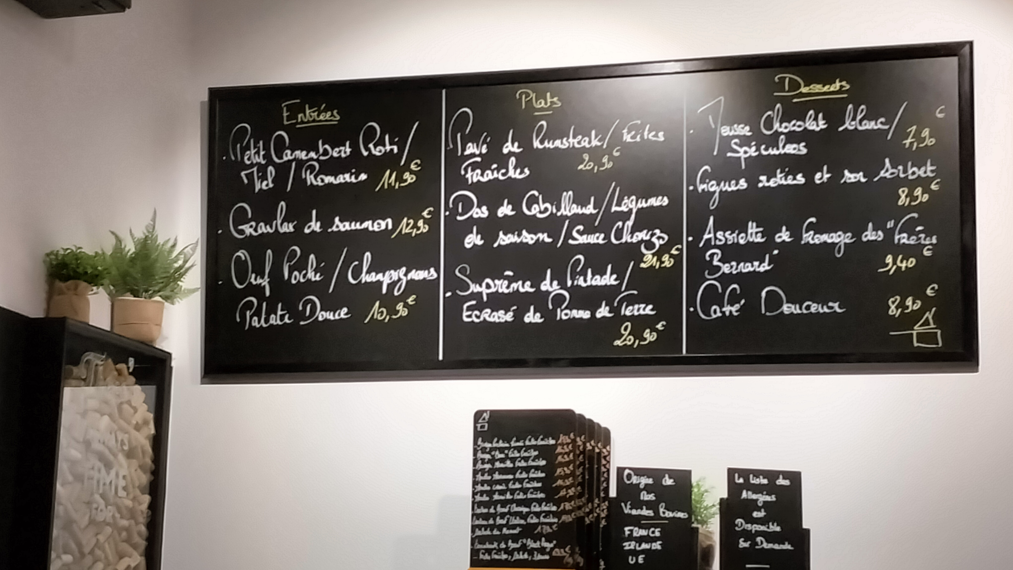 J ai bien aimé le concept de l ardoise avec 3 choix d entrées, de plats principaux et desserts. Bon accueil. Par contre les tables sont trop rapprochées et du coup l ambiance est trop bruyante, dommage.