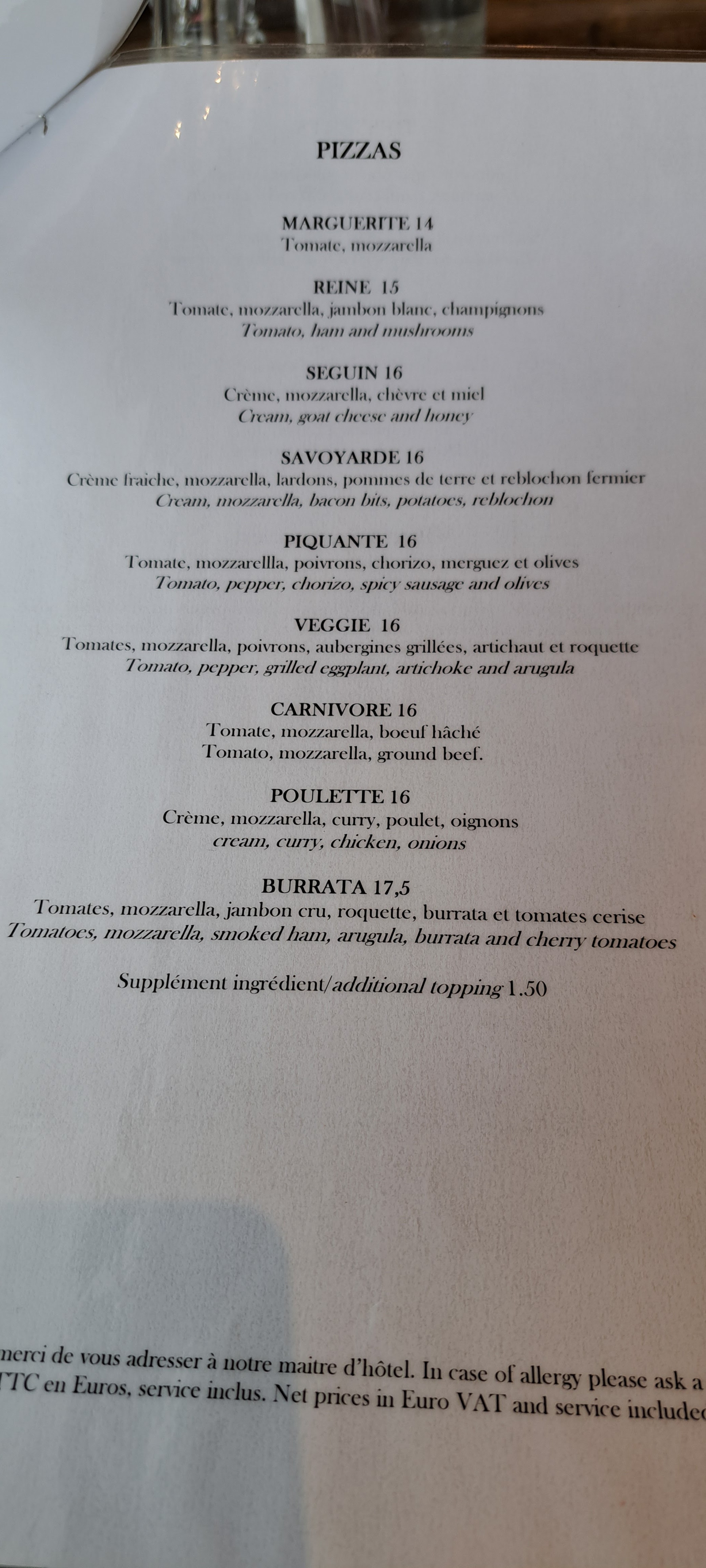 Serveuses très efficaces et rapide, pratique pour s'arrêter entre les pistes. Plutot chaleureux et peu bruyant malgré le monde. Décoration charmante quoi qu'un peu étrange (les marionnettes je trouve ça un peu flippant :p ). La nourriture est délicieuse (en tout cas pour les pizzas) et les autres plate ont l'air tout aussi bon. En bref, je recommande chaudement.