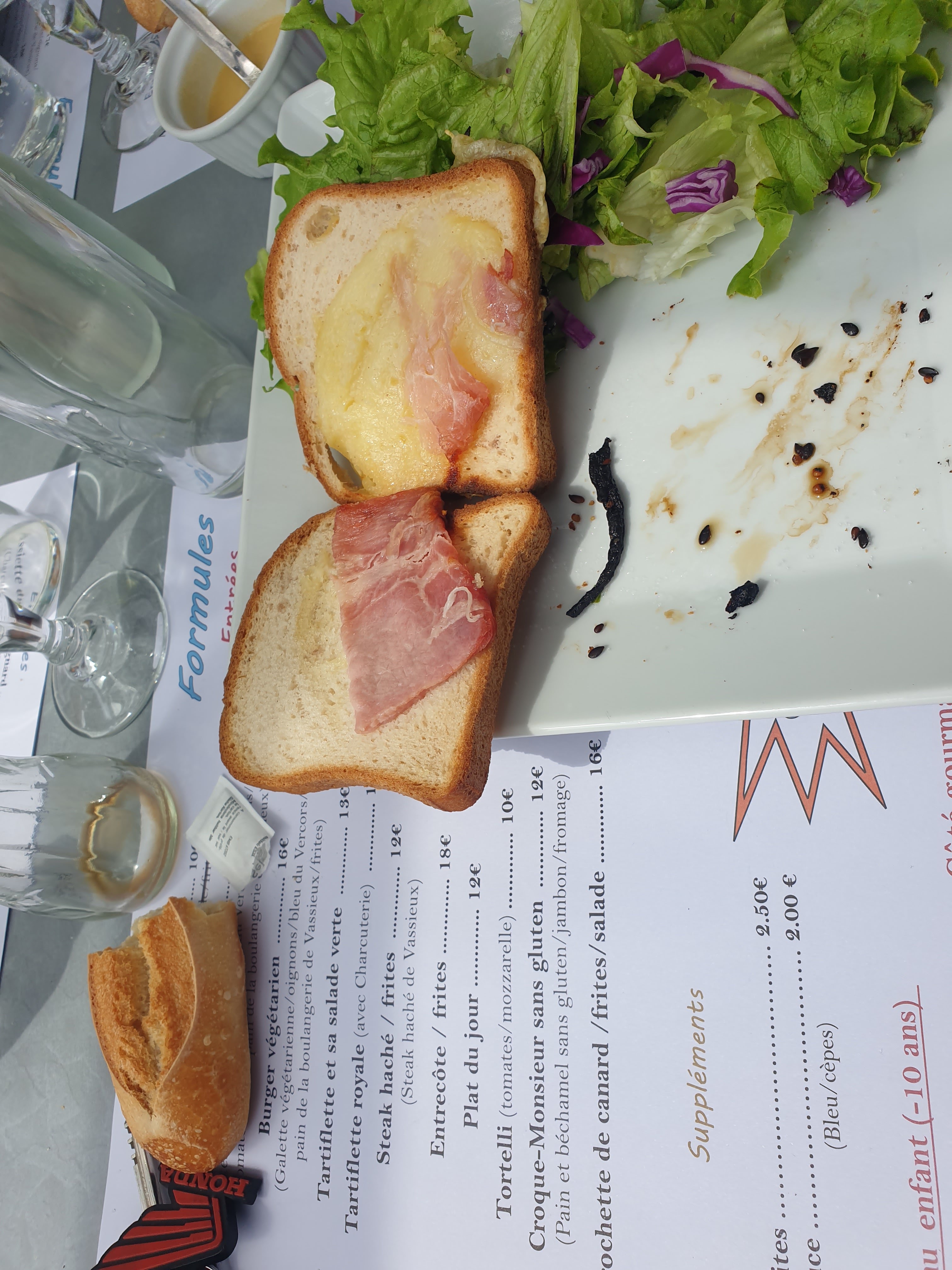 Une honte. Si l'attrape touriste devait avoir une adresse cela serait ici. Leur spécialité la Besante pâtes cuites au bouillon de poule il s'agit de farine mélangée à de l'eau sans aucun assaisonnement = 10€ Les croc monsieur, 2 tranches Harris (petites) avec une demi tranche de jambon et un peu de crème = 12€ L'assiette de charcuterie de métro: 3 rosette 1 jambon blanc 1 bout de pâté = 15€ --- pour une région de produit régionaux exceptionnels c'est bien triste. Impossible de demande des haricot à la place des frites: c'est trop long a préparer. Donc du congelé. Nous avons hésité à partir avant le dessert....