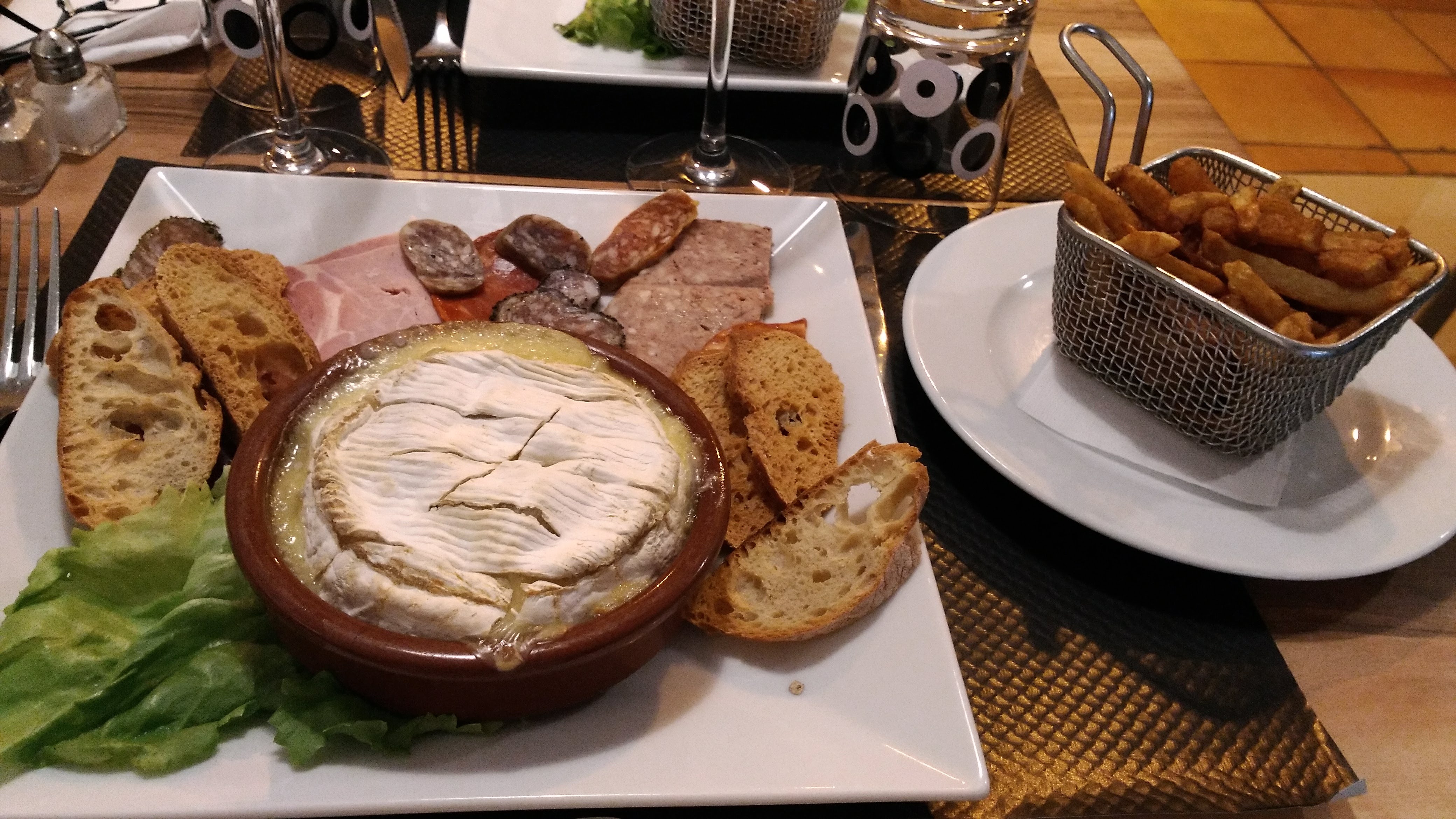 Nous avons pris une boisson sans alcool et le camembert avec sa charcuterie accompagné de frites Il ne manquait rien !!