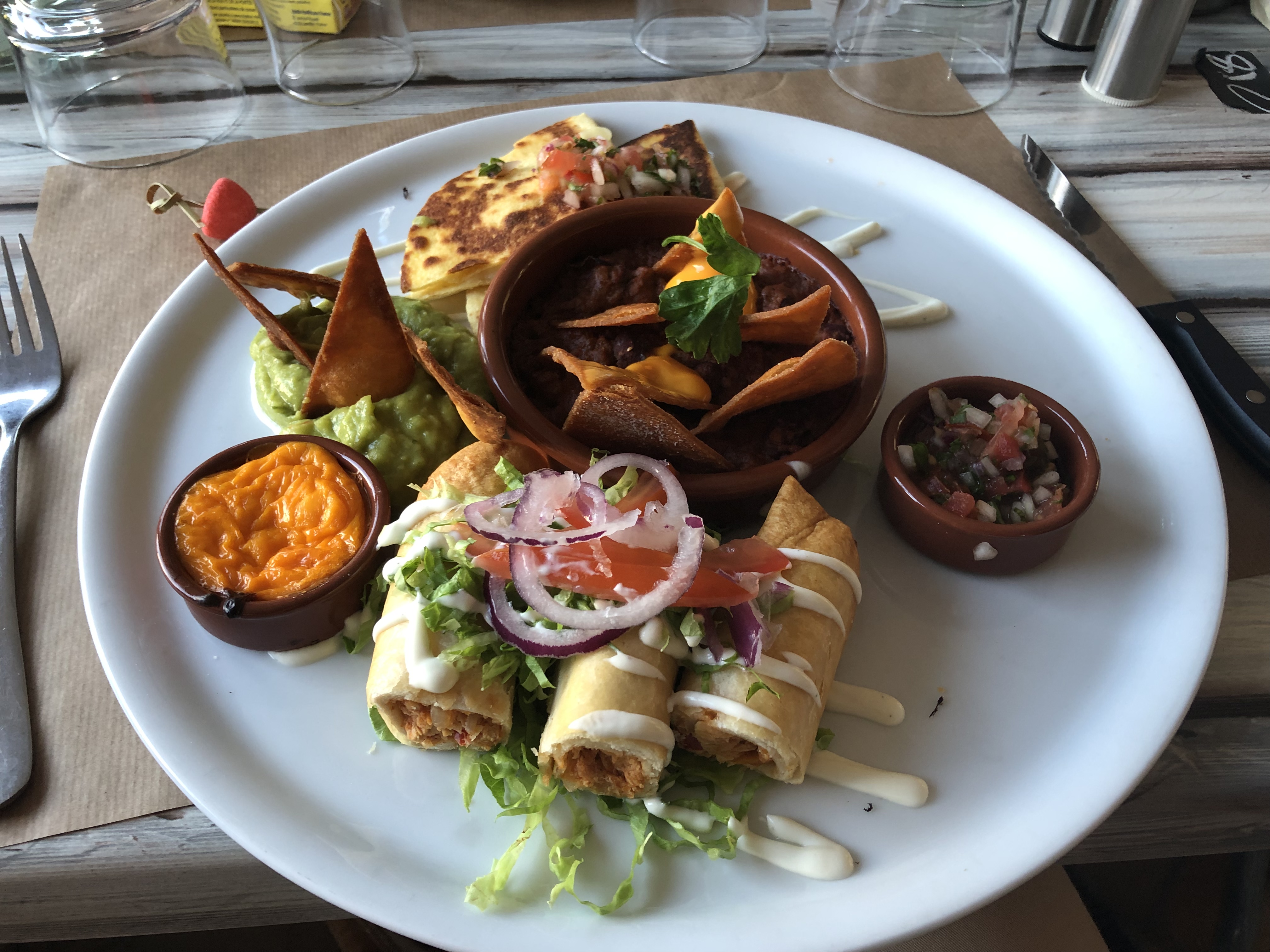Repas médiocre ( brochette de gambas à l'ananas : trois crevettes deux morceaux de saumon et deux carrés d'ananas ). Et surtout une dizaine de mouches bleues sur les assiettes : proximité des poubelles remplies.) Personnel néanmoins aimable.