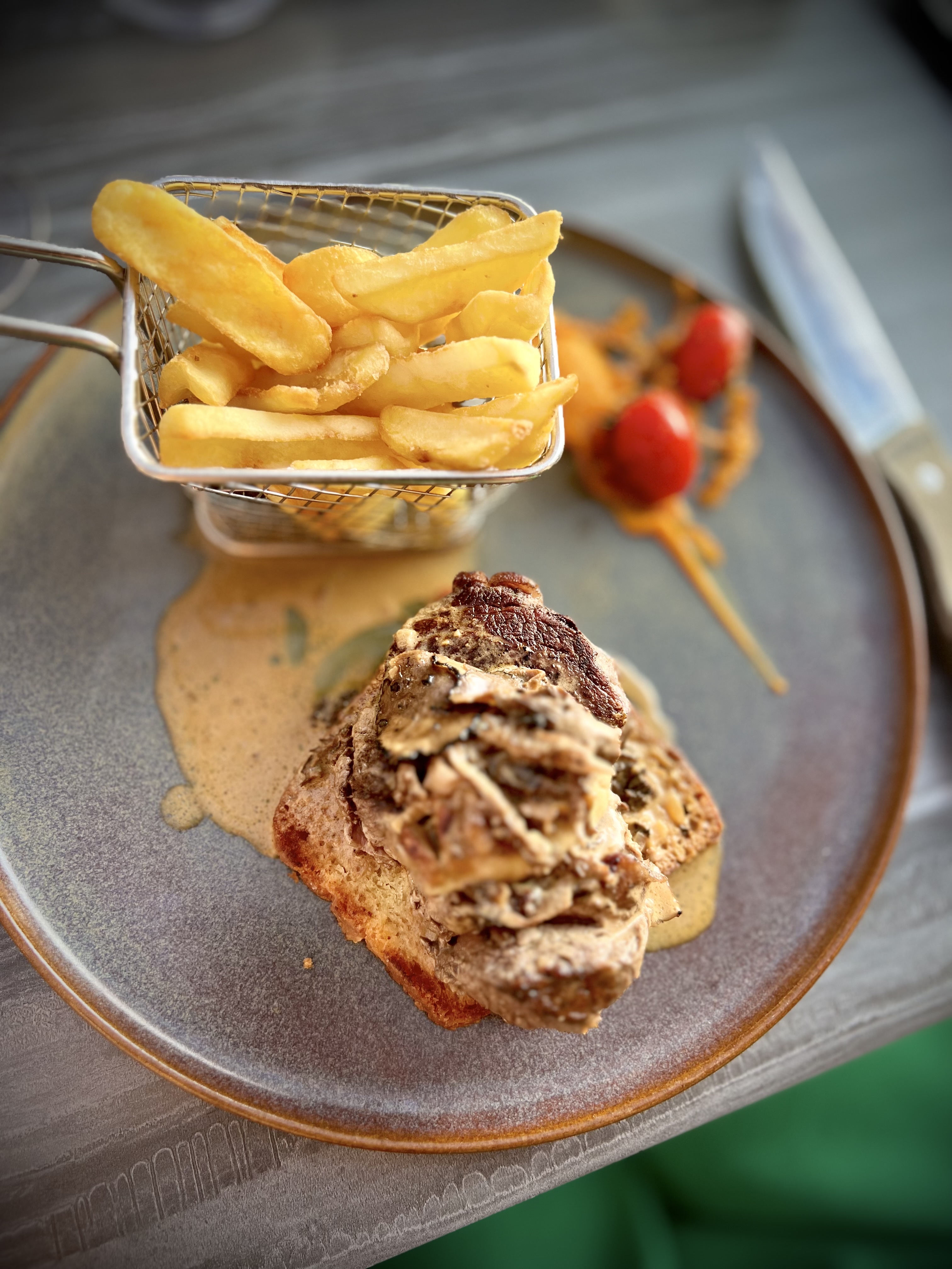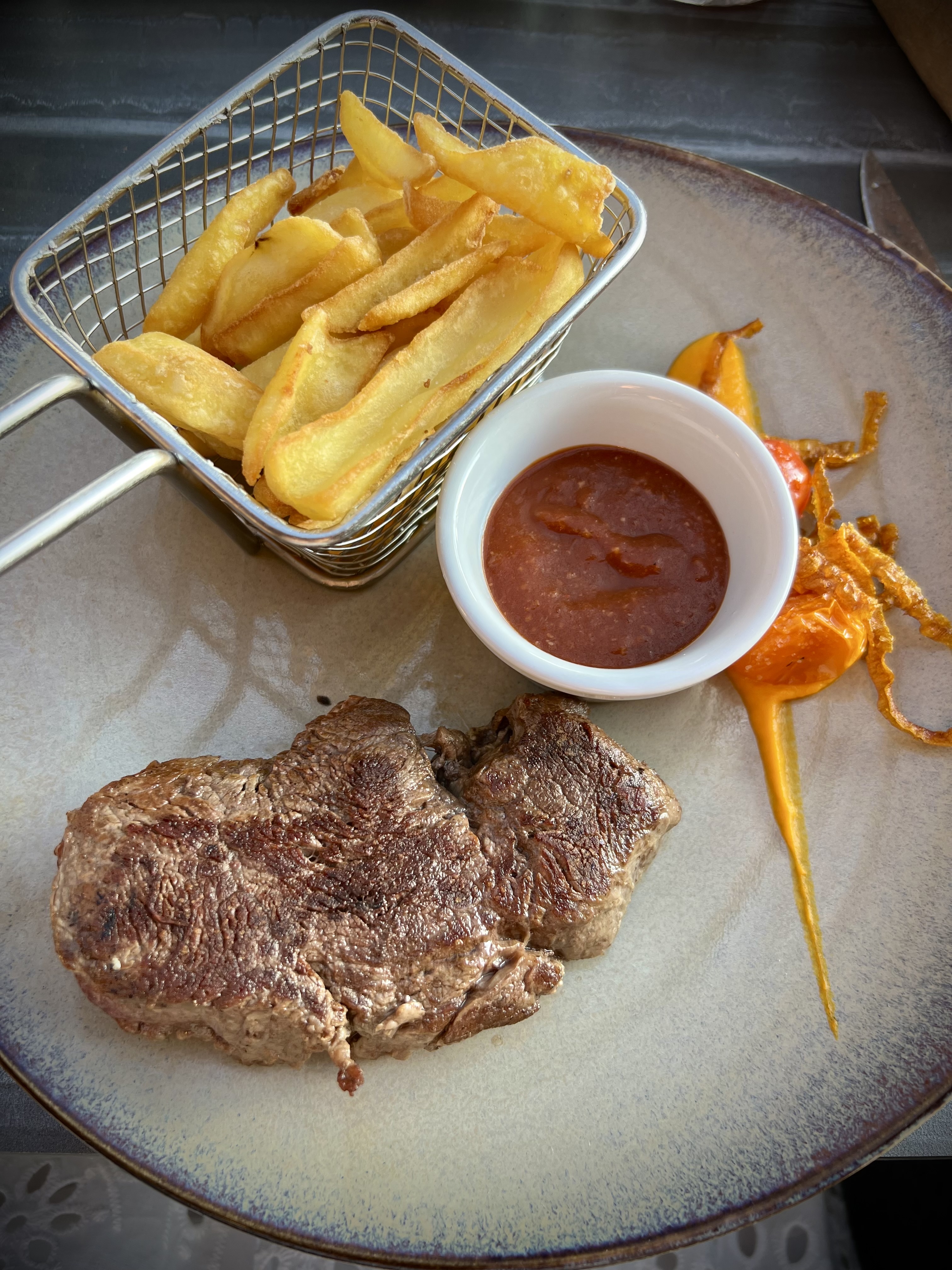 Première fois dans cette établissement et certainement pas la dernière. Dès notre arrivée, j’ai été étonnée par la politesse de tous les serveurs qui nous ont tous dit bonjour les uns à la suite des autres. Service excellent, aux petits soins sans en faire trop pour autant, viande à tomber par terre tellement elle était tendre et goûteuse. Juste dommage que les frites en accompagnement soient industrielles, on aurait visé le parfait. Fondue de fruits et de bonbons en dessert copieuse et très bonne. Prix tout à fait abordables et pas exorbitants, du moins c’est en accord avec la qualité de l’accueil et de la cuisine. De plus cadre super agréable en terrasse avec un fond sonore ni trop fort ni pas assez. Nous reviendrons avec plaisir, félicitations à toute l’équipe de salle et de cuisine. Au plaisir.